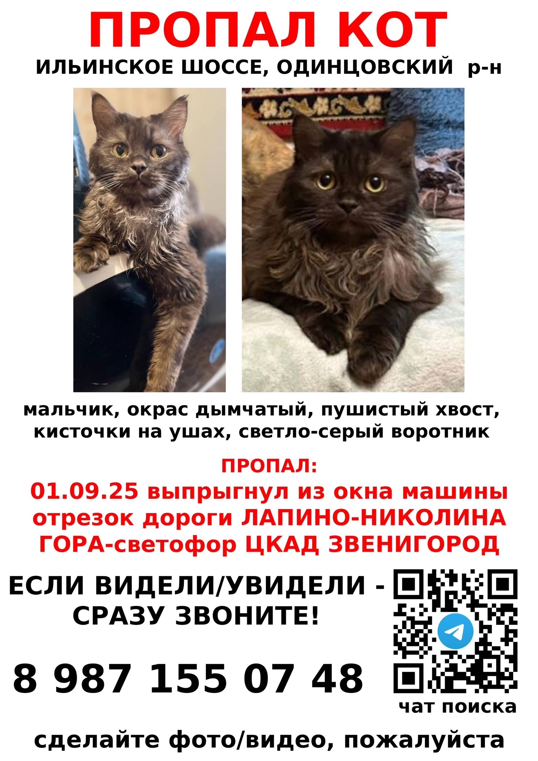 Пропал кот Одинцово 1 сентября 2025 году у нас из машины выпрыгнул..
