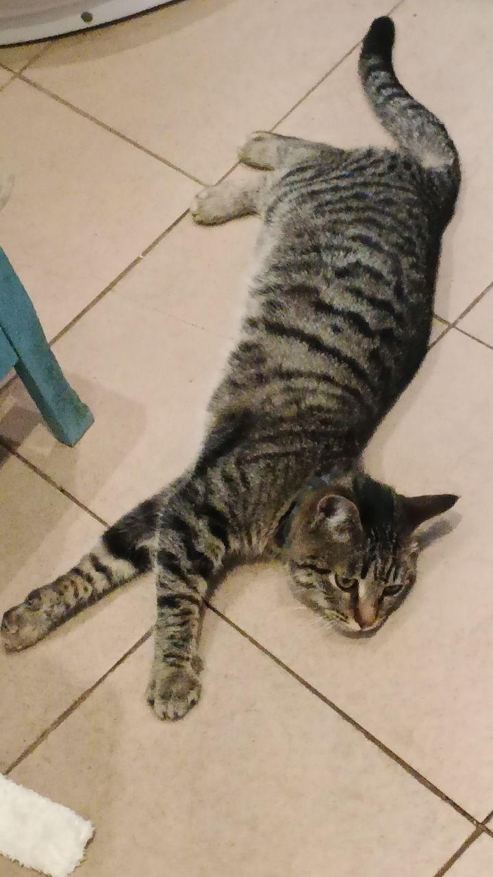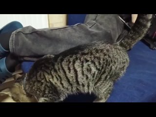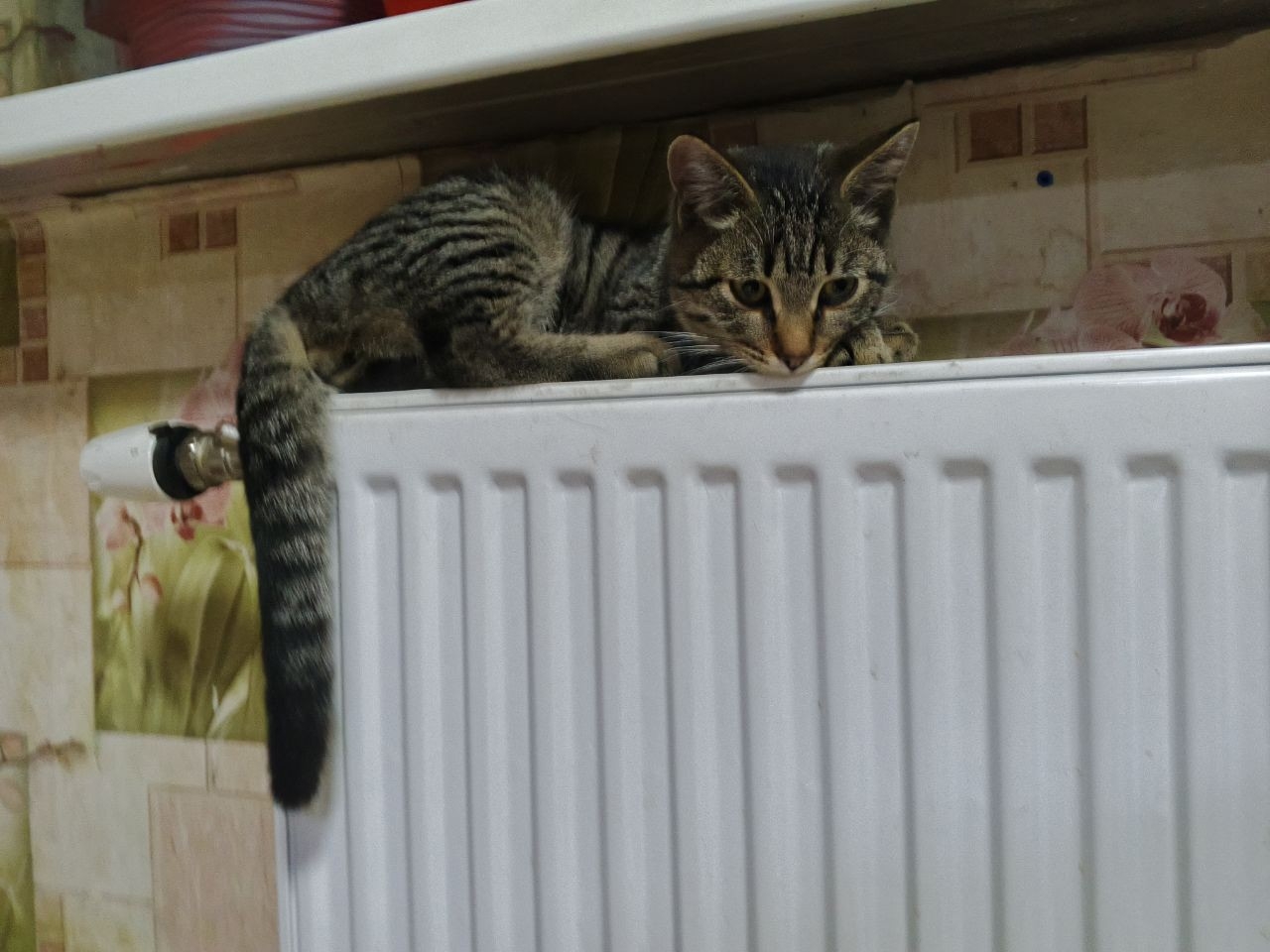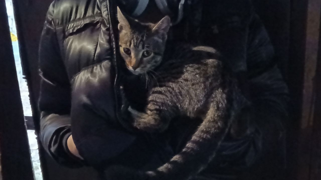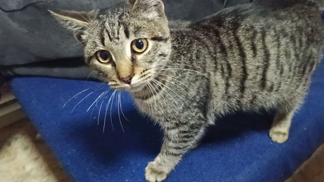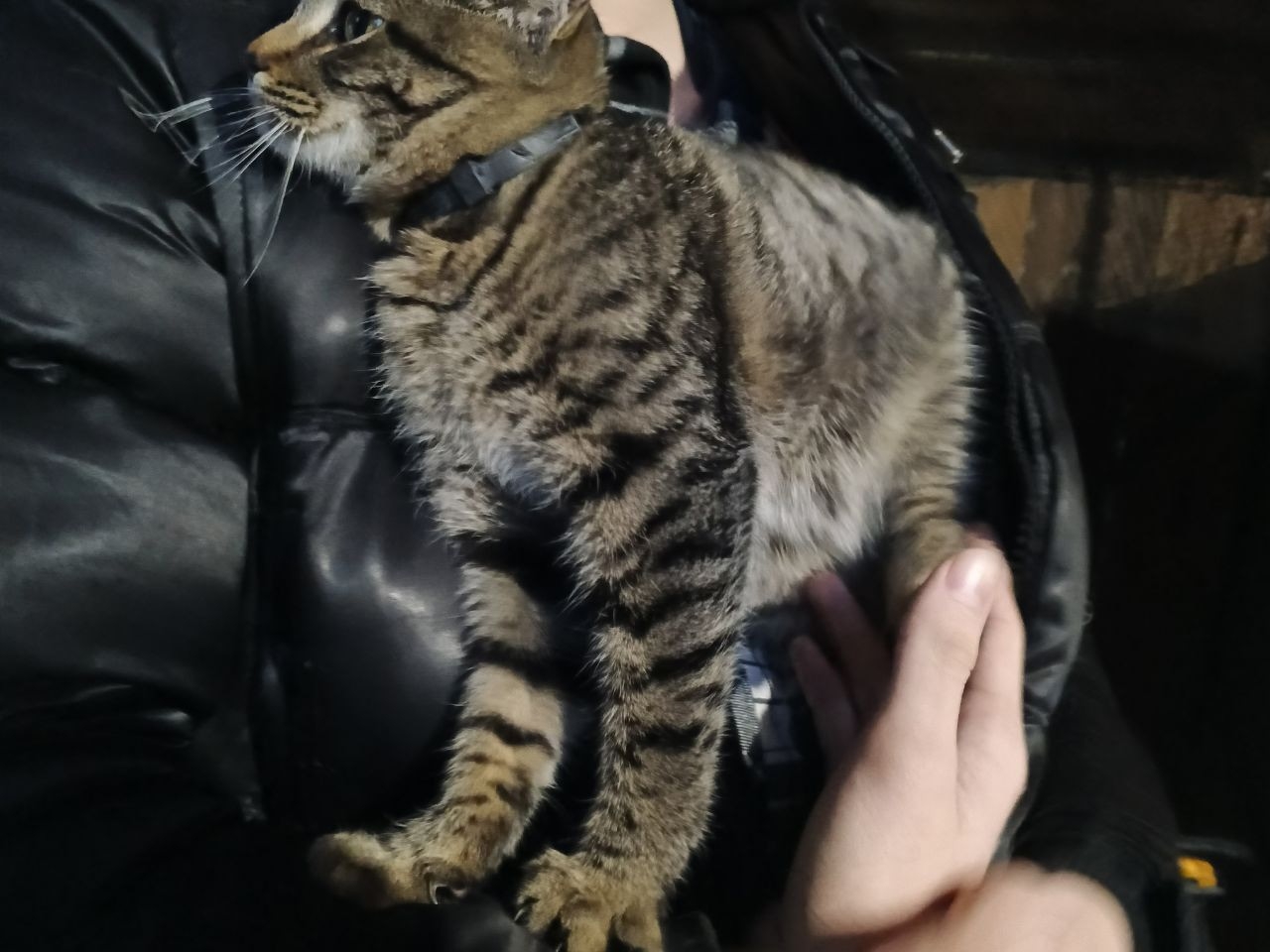 Из примет: полностью полосатый окрас, черный ошейник (против блох), длинный хвост, большие лапы, крупная голова, нос и уши, при этом с не очень большим телом, “трескучий” голос(есть на видео). Коту около 7-10 месяцев. Характер дружелюбный, спокойный, добрый