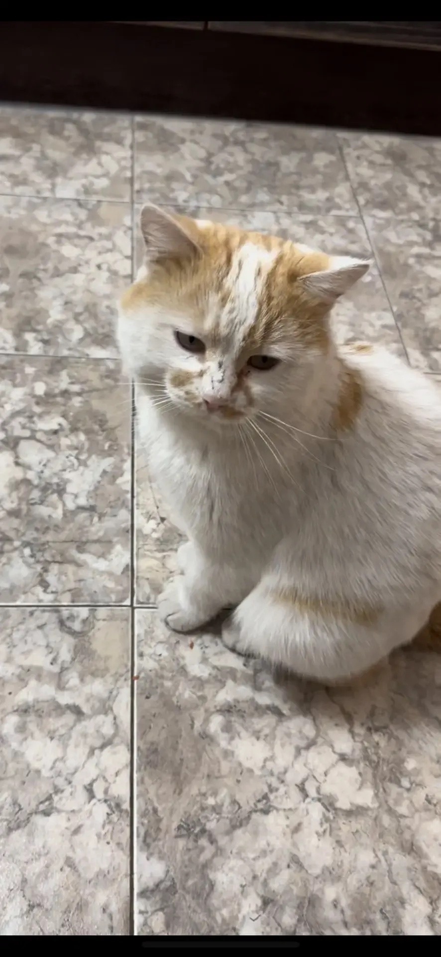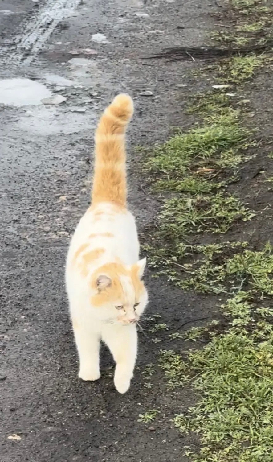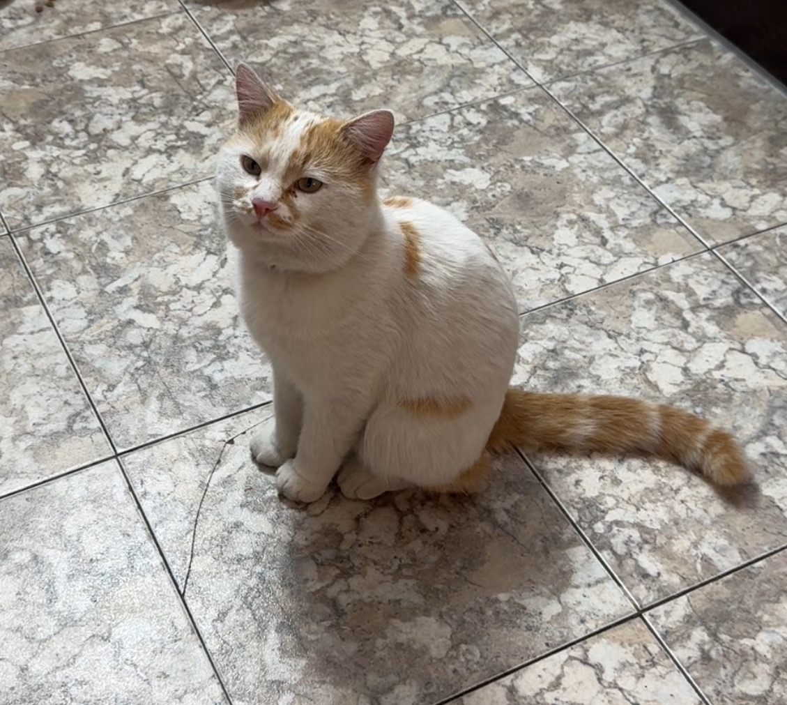 Приметы: белый с рыжими пятнами, на нем был красно-оранжевый ошейник.