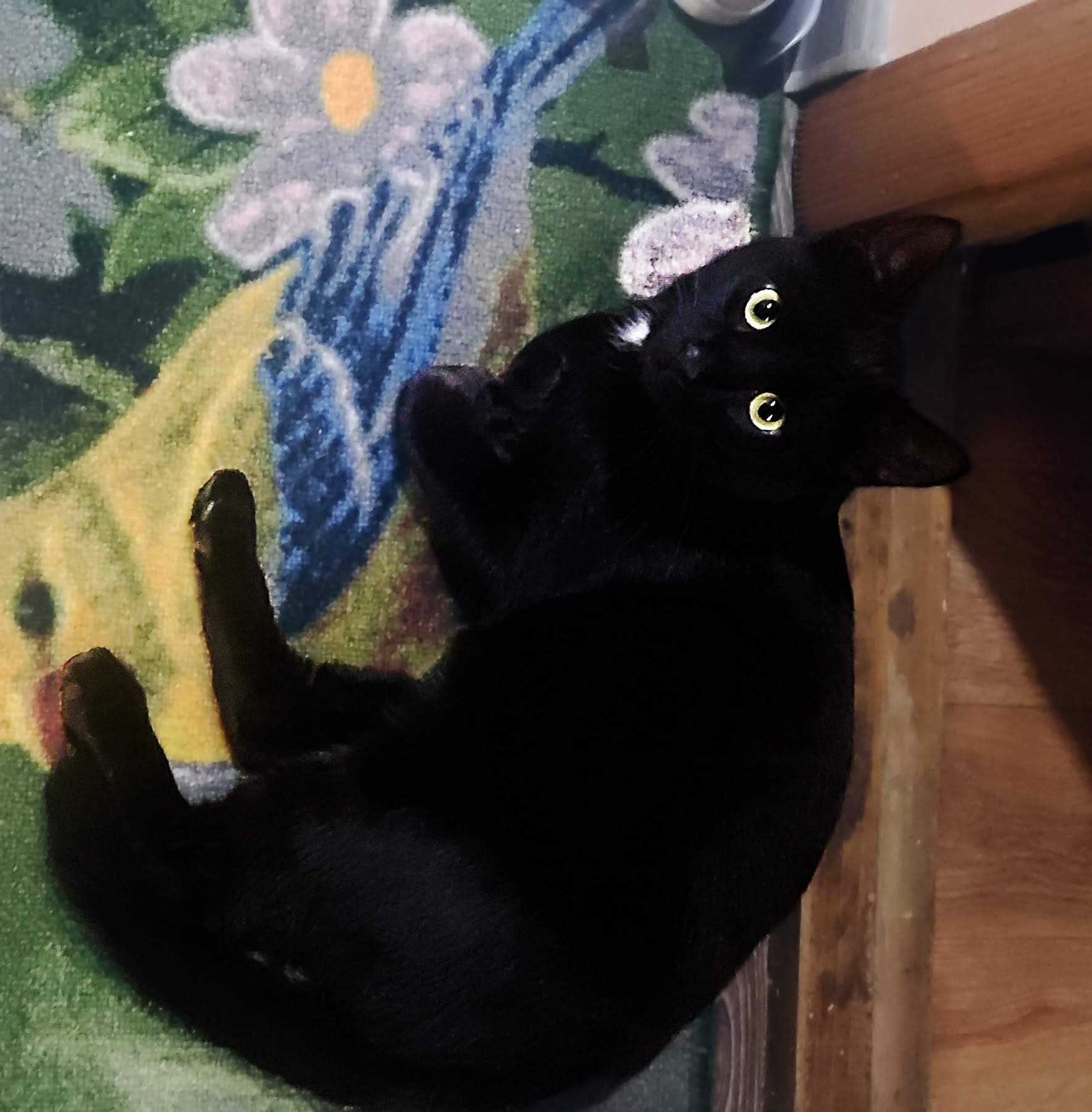 Описание: Черный окрас шерсти, имеет три белых пятна вдоль живота.