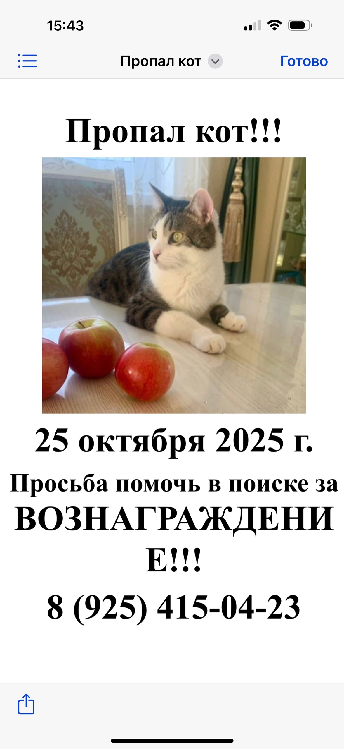 Пропал наш Барсик , в Домодедовском районе вблизи село Ям , мкр.. Домодедово Автор admin Опубликовано Окт 31, 2025 0 0 Поделится WhatsAppViberTelegramVKOK.ru Пропал наш Барсик , в Домодедовском районе вблизи село Ям , мкр Заречный , просьба что увидит сообщить нам пожалуйста🙏 0 0 Поделится