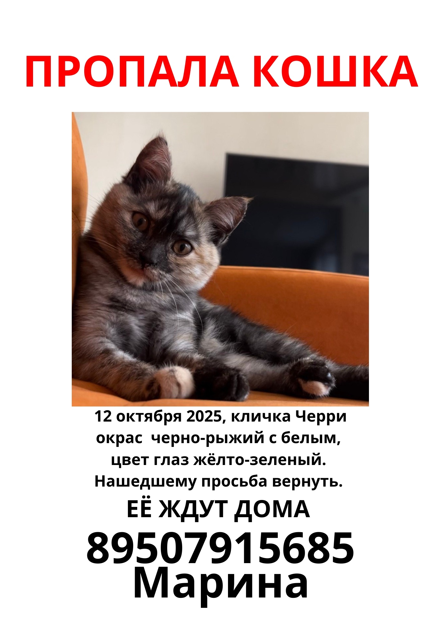Пропала кошка😭 В районе улицы 10 лет октября, нашедшему просьба.. Омск Автор admin Опубликовано Окт 15, 2025 0 0 Поделится WhatsAppViberTelegramVKOK.ru Пропала кошка😭 В районе улицы 10 лет октября, нашедшему просьба сообщить по номеру, её очень ждут дома🥺 0 0 Поделится