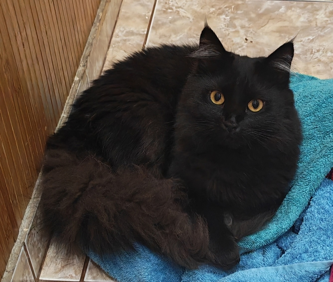 Ей чуть больше года, небольшая в размере, но с большим пушистым хвостом, большие кисточки в ушах, цвет чёрный переливается с коричневым (особенно в хвосте), янтарные глаза