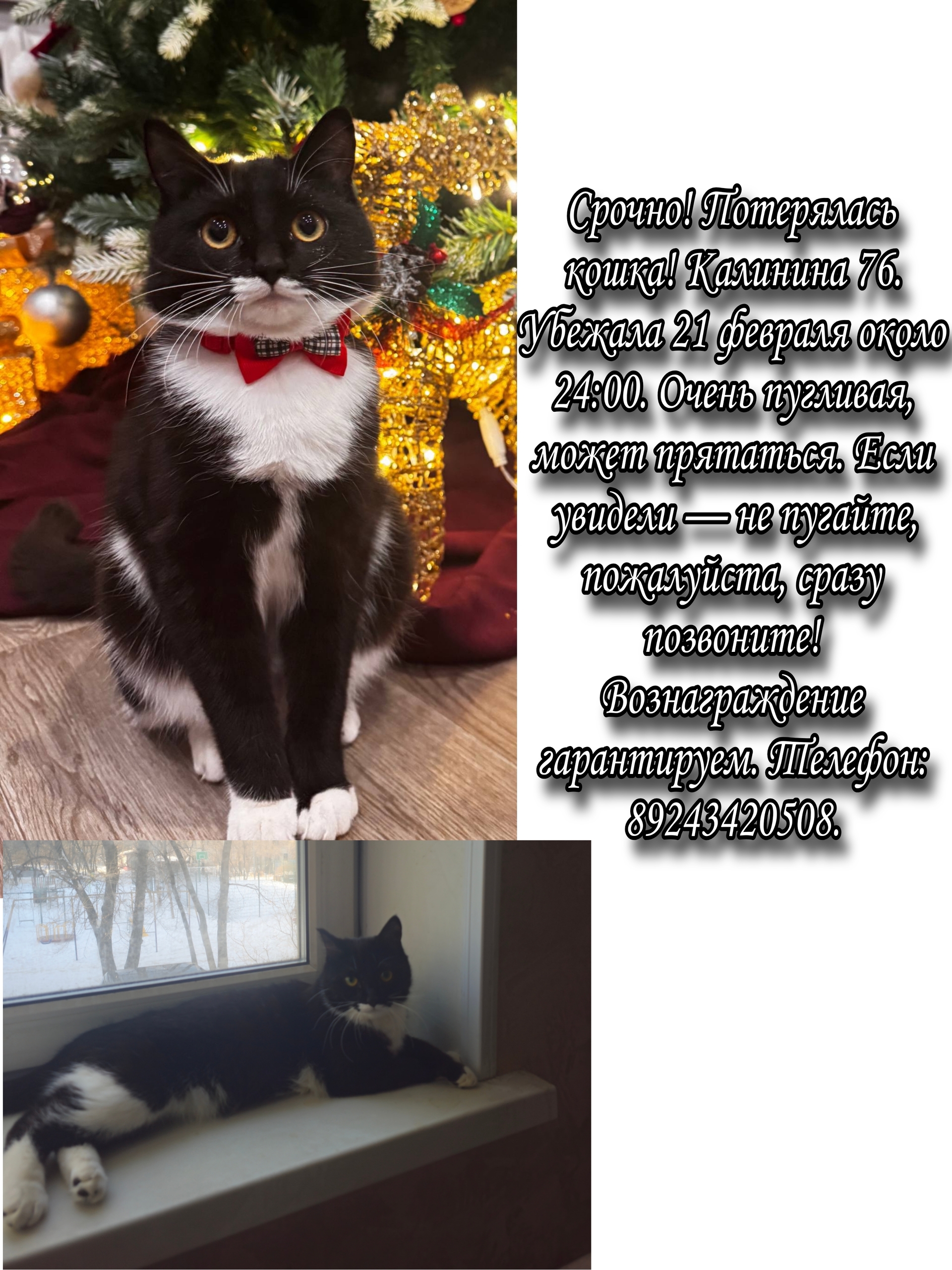 Кошка: молодая, 8–9 месяцев, окрас черно-белый, лапки белые ( как перчатки). Очень домашняя, пугливая, на руки к чужим не пойдёт. Была без ошейника.