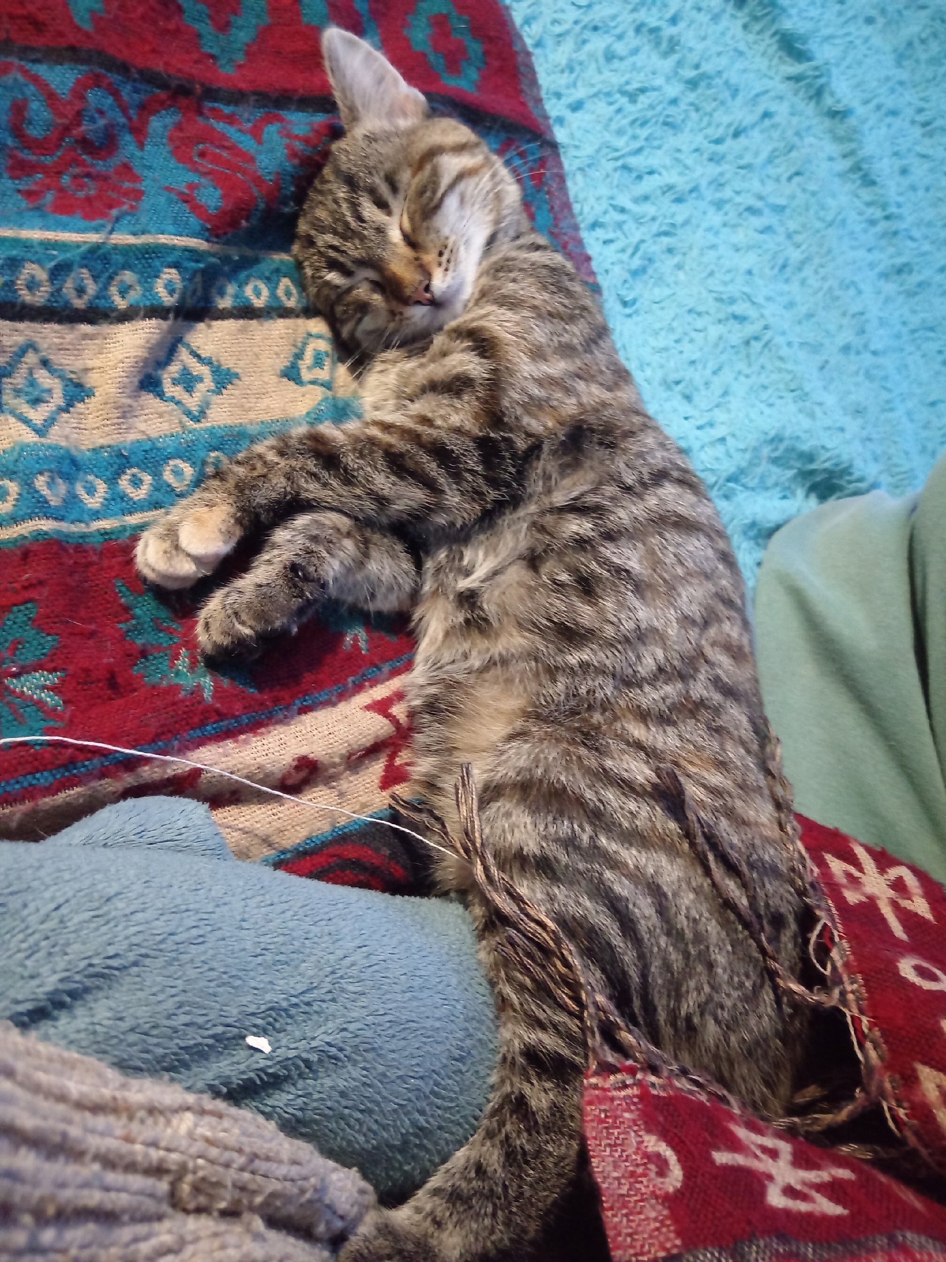 Молодая полосатая кошка. Без явных белых пятен. Котенку 4-5 месяцев, убежала в открытую дверь когда я выставляла магнитофон в подъезд. Заметила пропажу только через час, за это время она испугалась соседей и выбежала на улицу. Из явных отличий от других кошек такого окраса черное выразительное пятнышко на нижней губе. Обычно отзывается на имя и бежит крича, но самостоятельно мне найти ее не удается.