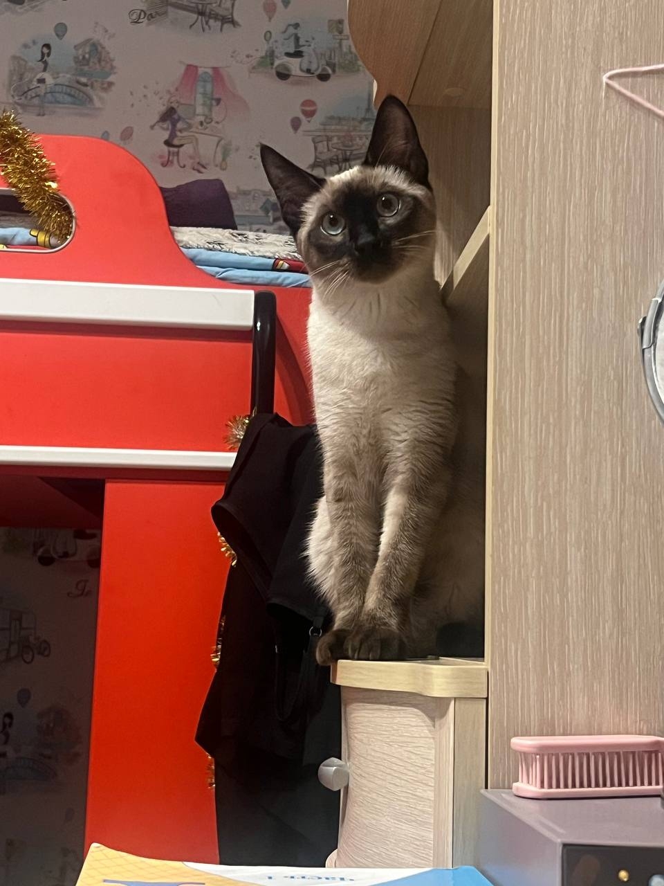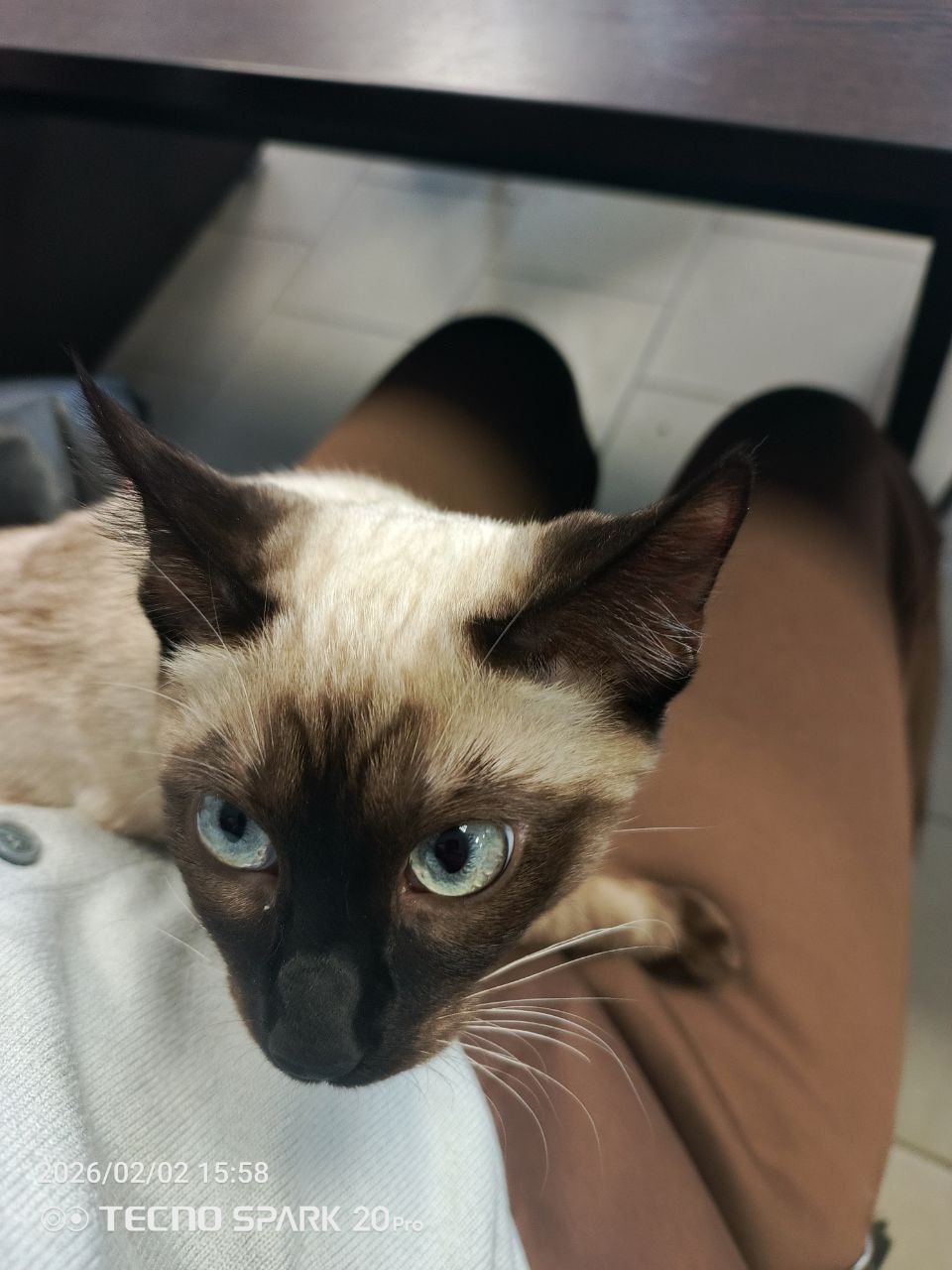 Всем привет! Внешность «Булочки» Основные черты ⦁ Окрас (Сил-пойнт): У неё характерный контрастный окрас. Основной цвет шерсти — светлый, кремово-бежевый, а “пойнты” (мордочка, уши, лапы и хвост) окрашены в глубокий темно-коричневый, почти черный цвет. ⦁ Мордочка: У кошки очень выразительная тёмная «маска», которая покрывает почти всю мордочку, подчеркивая форму глаз. ⦁ Глаза: Большие, миндалевидной формы. На фото они кажутся светлыми, серо-голубыми, с очень внимательным и даже немного «изумленным» взглядом. ⦁ Уши: Крупные, высоко поставленные и острые, что придает ей очень чуткий и аристократичный вид.
