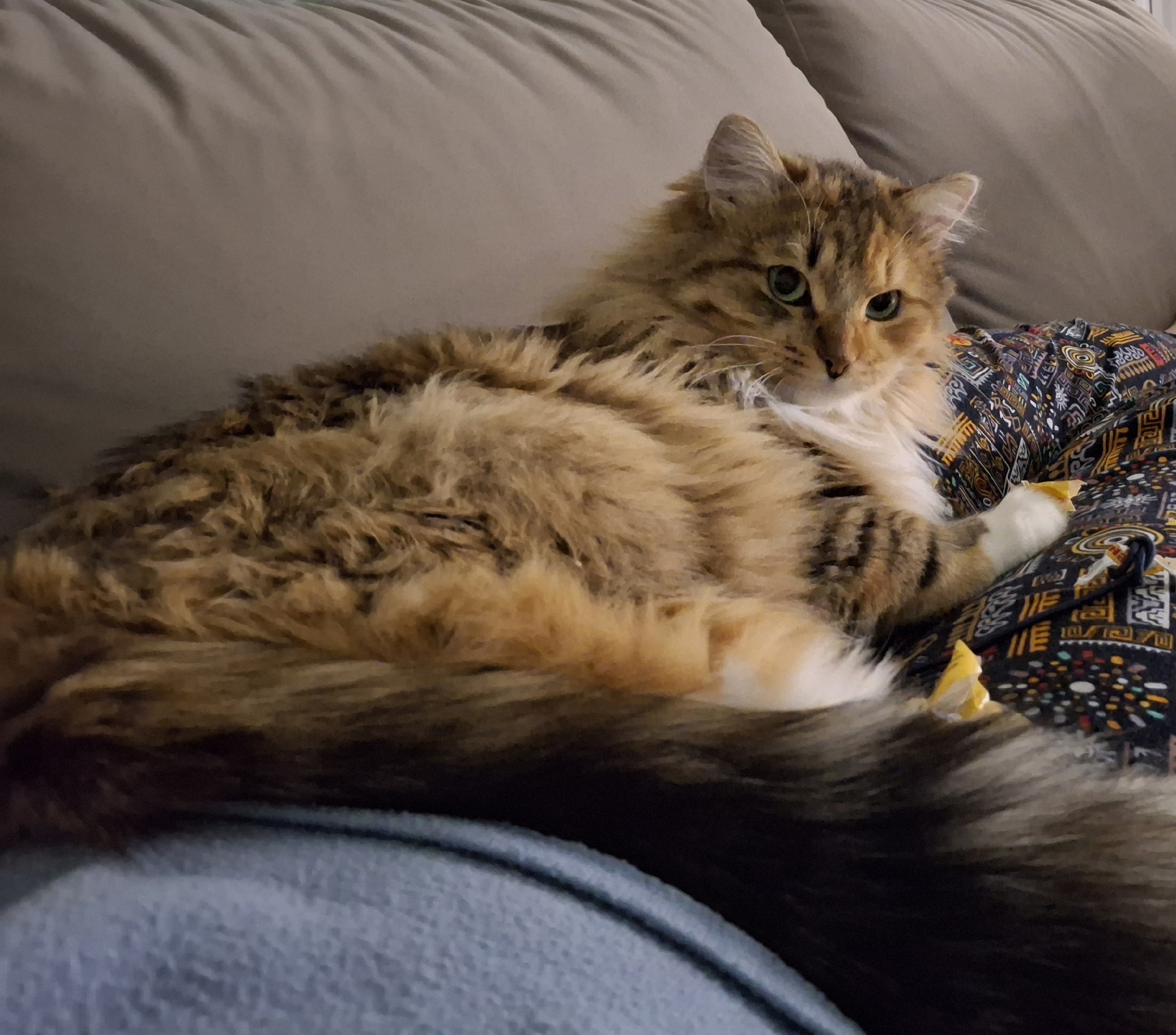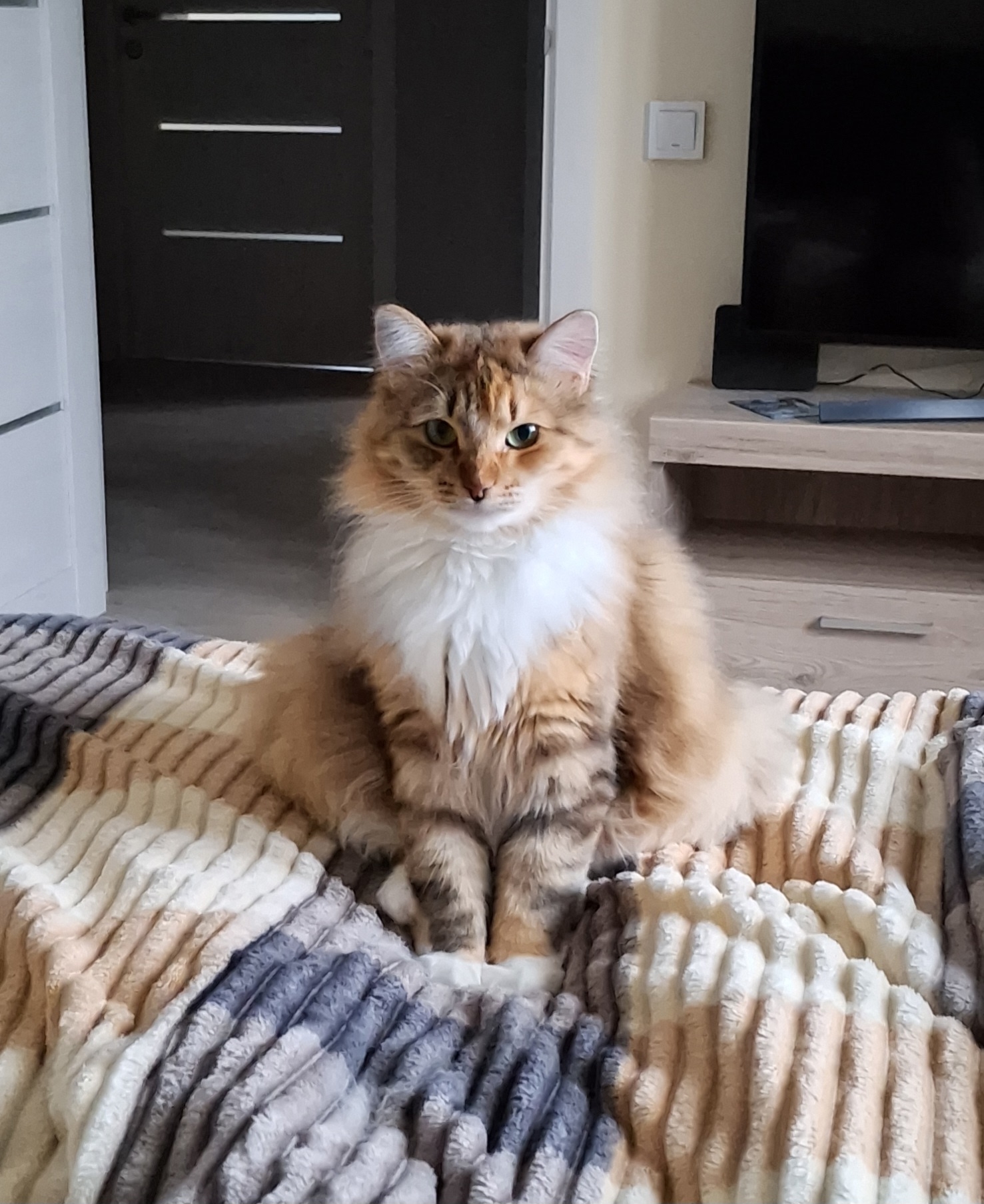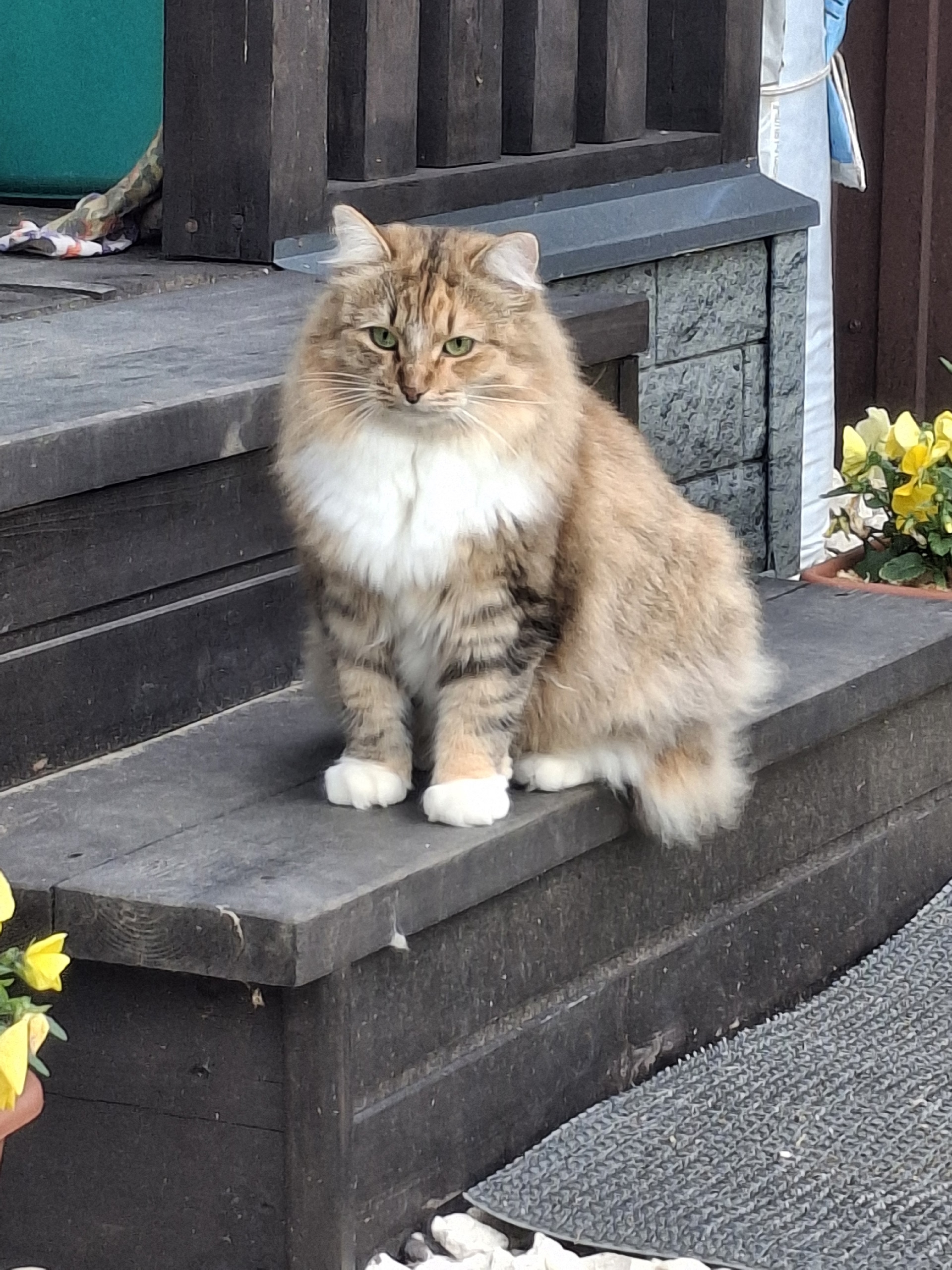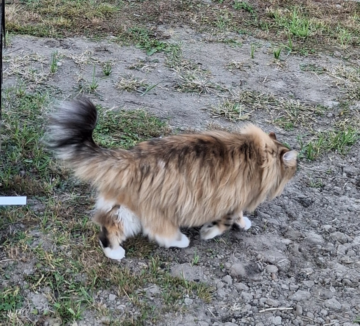 Кошечка сибирской породы, кличка Ася. Окрас трехцветный, в основном рыжий и белый. Кошка осторожная и пугливая. Самочка, стерилизованная.