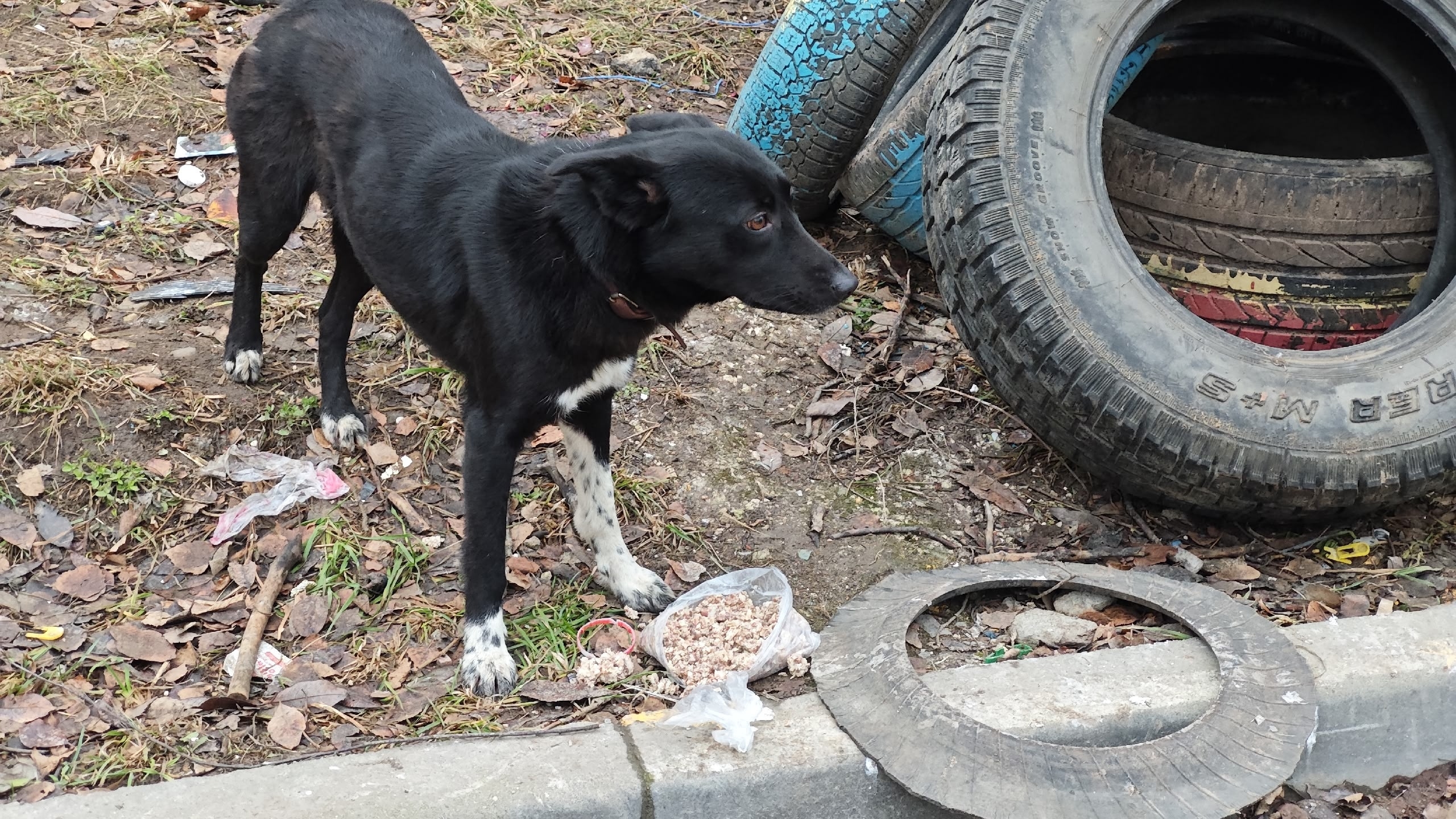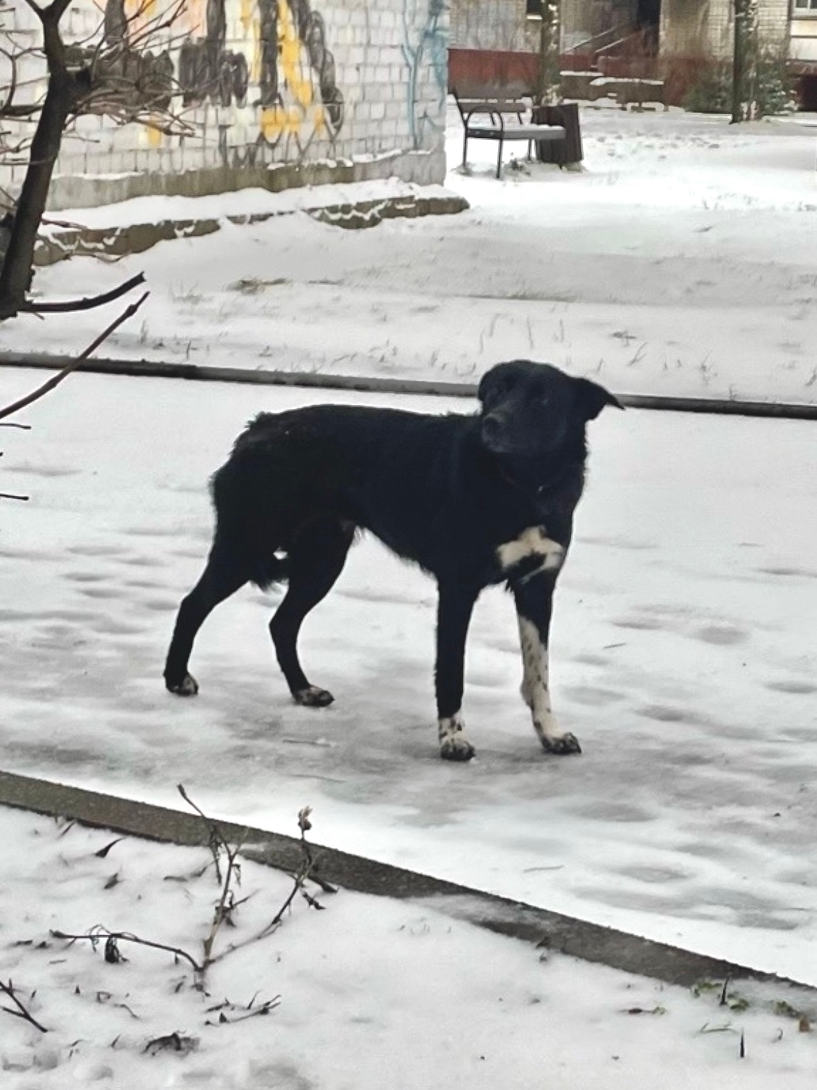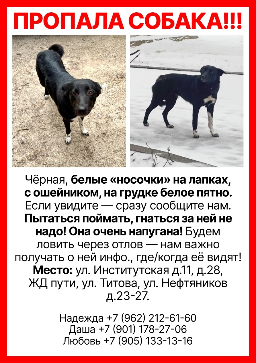 Чёрная, с белыми «носочками» на лапках, в ошейнике, на грудке белое пятно. Собака очень напугана. ПЫТАТЬСЯ ЛОВИТЬ, БЕЖАТЬ ЗА НЕЙ ИЛИ ПРИДЕРЖИВАТЬ — НЕ НУЖНО.