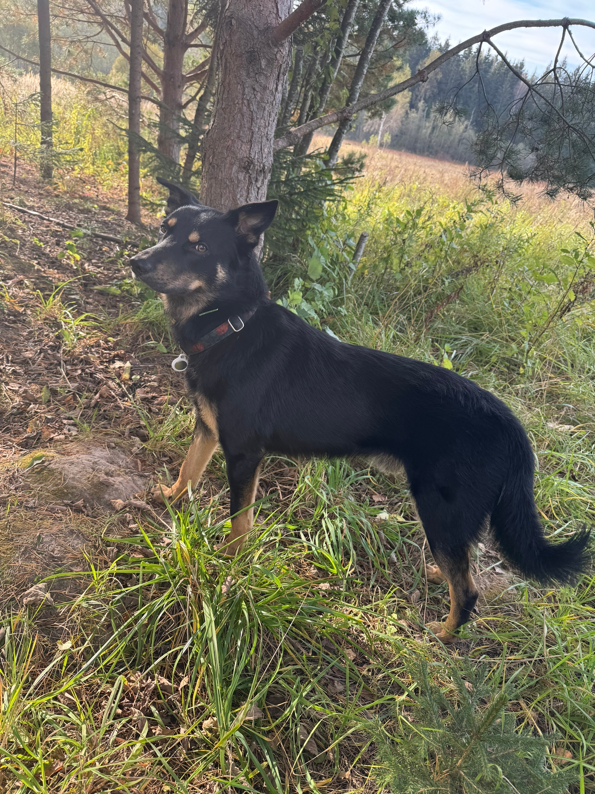 Погнался за зверем и убежал молодой пёс Бруно. Среднего размера (чуть выше колена), окрас черный с рыжими лапами и бровями. Хвост баранкой.