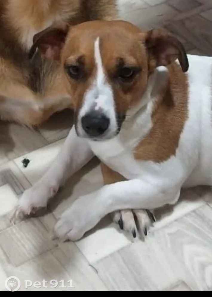 Девочка джек-рассел терьер, белый окрас с ярко коричневыми пятнами, на животе множество родимых пятен.