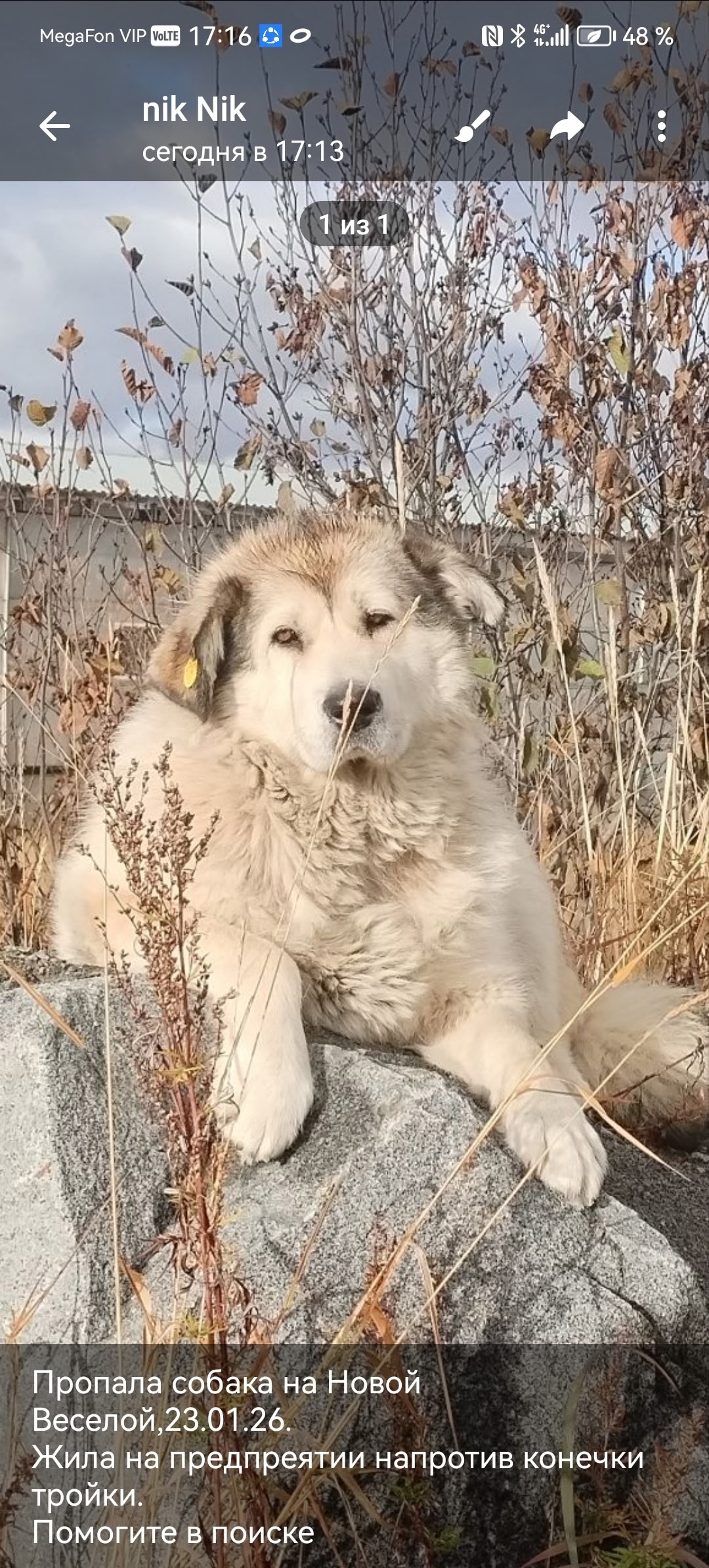 Пропала собака,22.01.26 на Новой Веселой,жила на предприятии.. Магадан Автор admin Опубликовано Мар 28, 2026 0 0 Поделится WhatsAppViberTelegramVKOK.ru Пропала собака,22.01.26 на Новой Веселой,жила на предприятии напротив конечки тройки. Помогите в розыске 0 0 Поделится