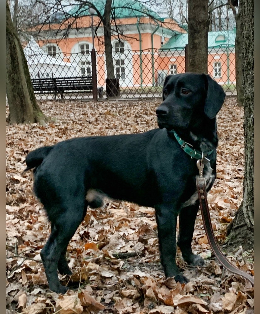 Зовут Рокки, зеленый ошейник,хвост купирован.