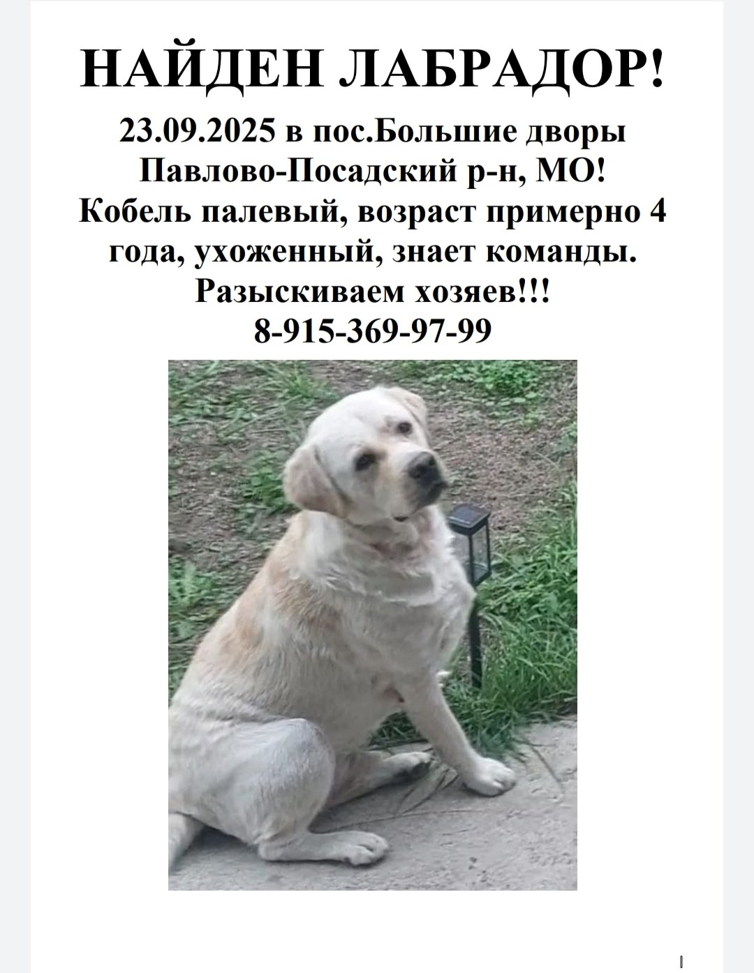 Прошу репост! Московская область, Павлово-Посадский район, пос.Большие дворы, 23.09.2025 найден палевый кобель лабрадора! Ищем хозяев!