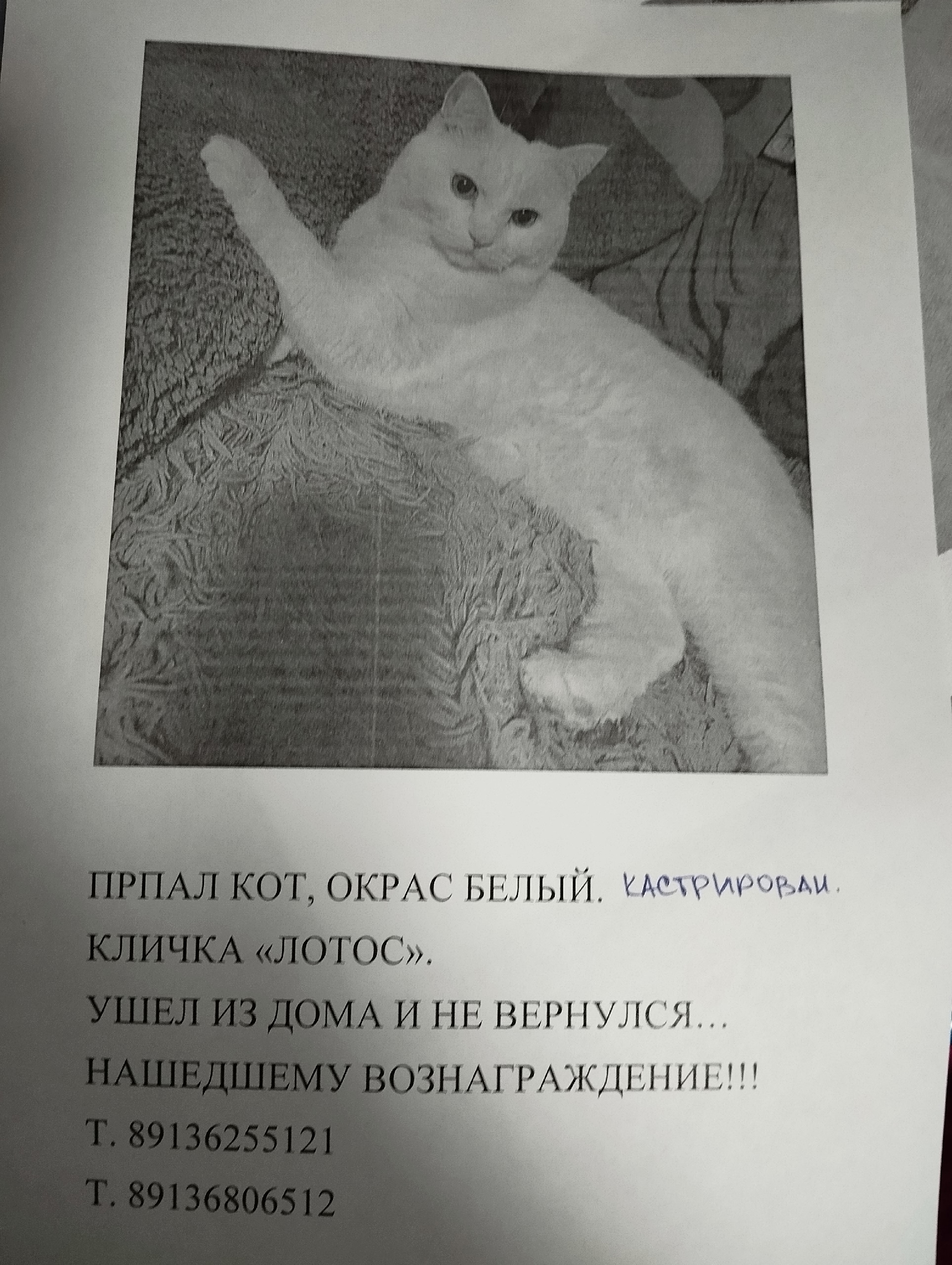 Прошу сообщить о местонахождении кота, если кому извесно… Омск Автор admin Опубликовано Сен 27, 2025 0 4 Поделится WhatsAppViberTelegramVKOK.ru Прошу сообщить о местонахождении кота, если кому извесно. Центральный район, . Это не просто кот, это член семьи. Это наш Лотос. 0 4 Поделится
