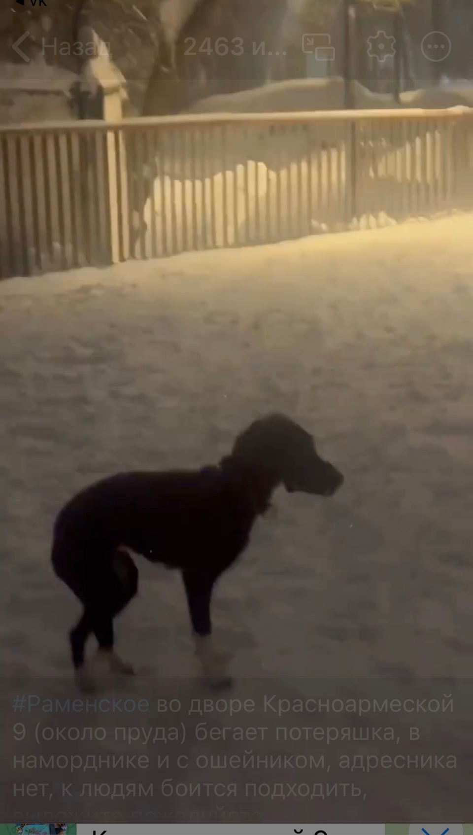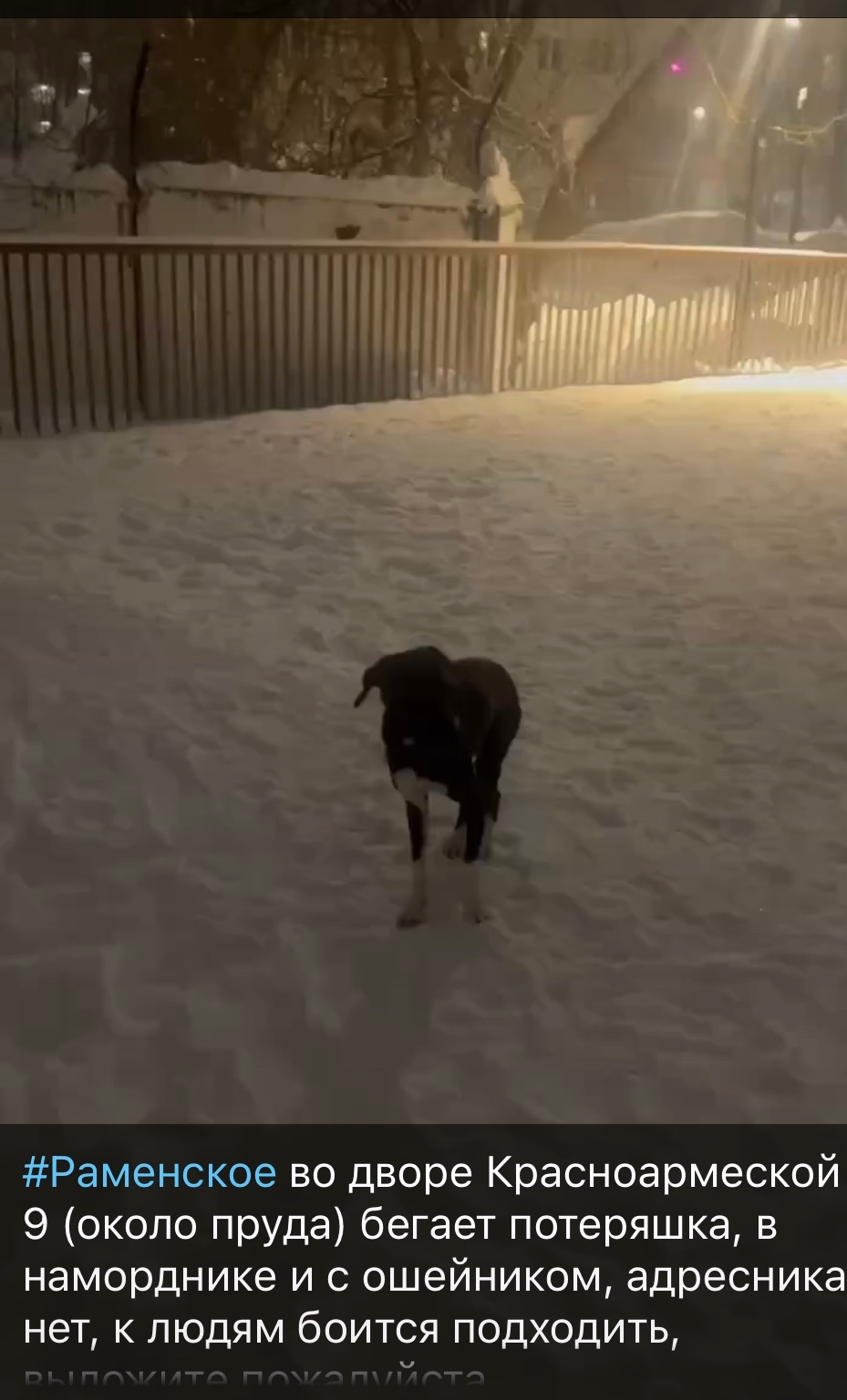 #Раменское во дворе Красноармеской 9 (около пруда) бегает потеряшка, в наморднике и с ошейником, адресника нет, к людям боится подходить, выложите пожалуйста