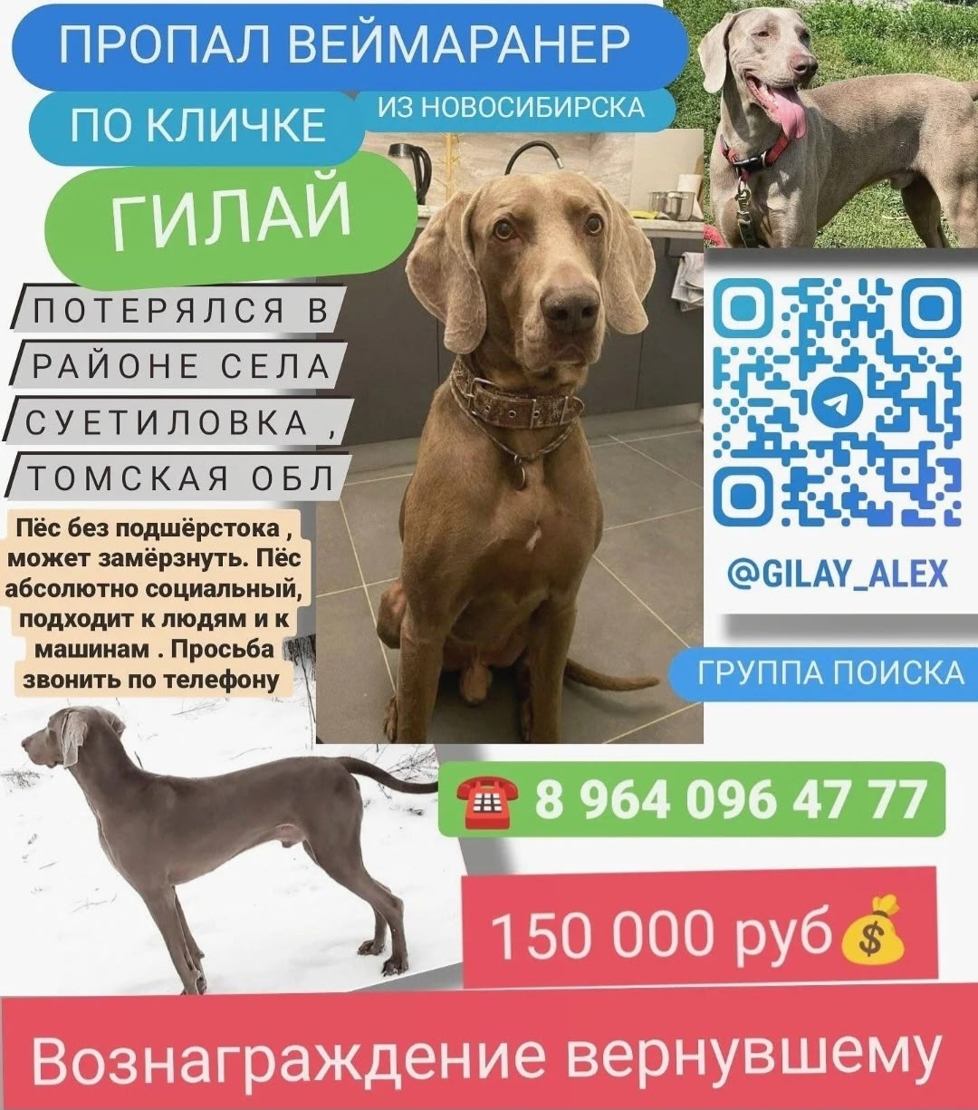 Розыск! По всем городам! Веймаранер из Новосибирска по кличке..