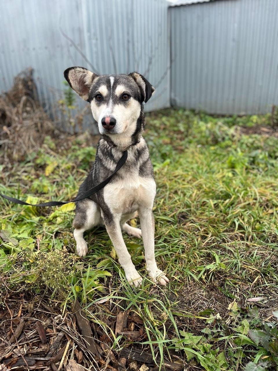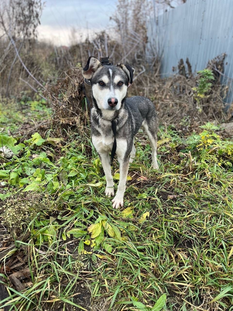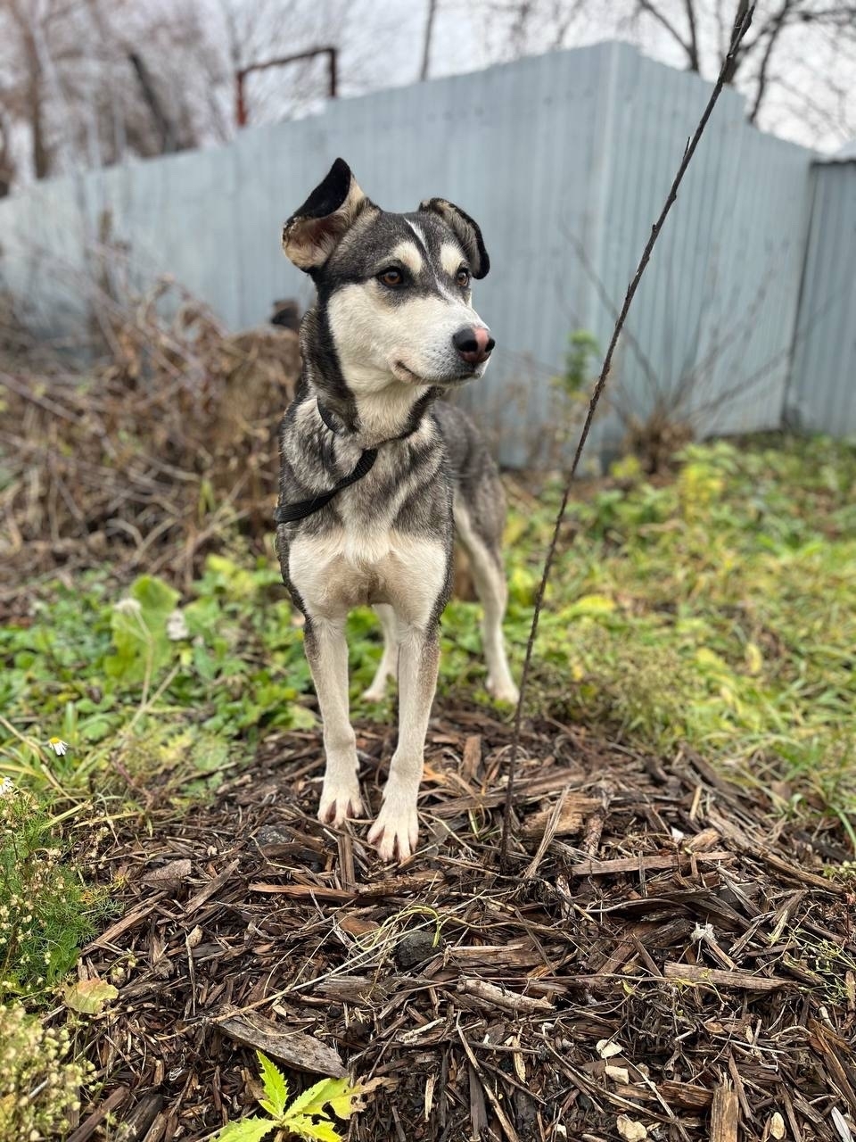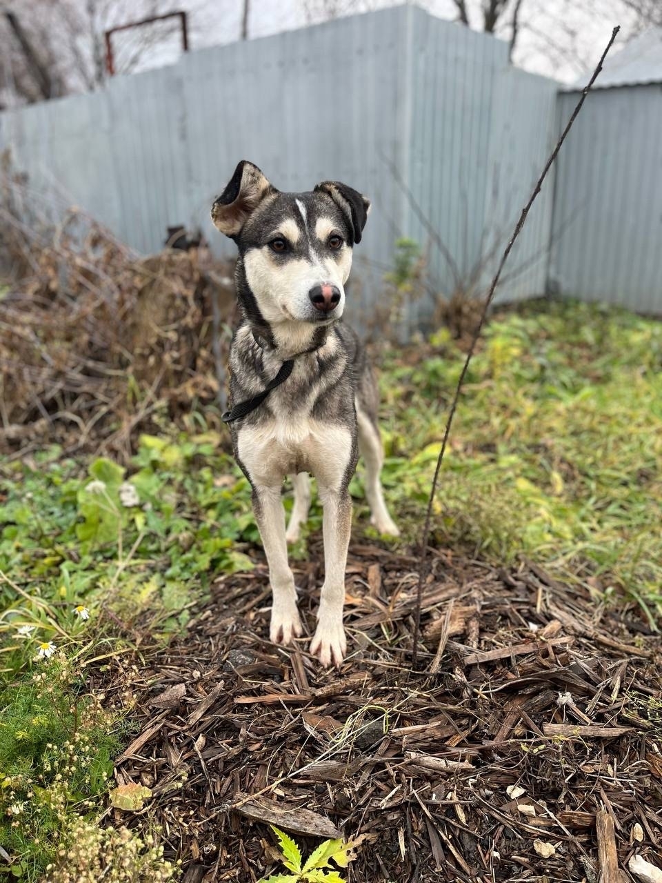 Кобель, метис хаски — молодой, очень энергичный, с выразительным взглядом, который будто спрашивает: «Где ты, мой человек?»
