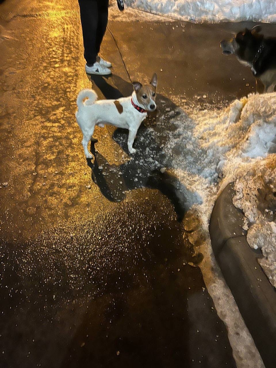 Белый с рыжими пятнами окрас, кобель, в красном ошейнике