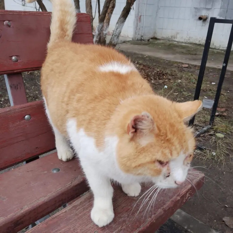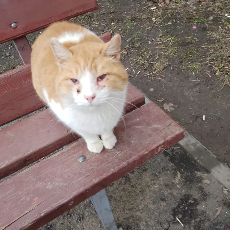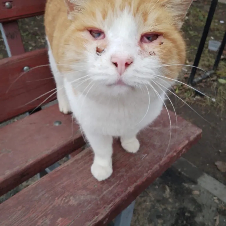 Саратов! У соседнего дома на лавочке постоянно сидит кот. Жильцы сказали что ничей. Глаза в ужасном состоянии.