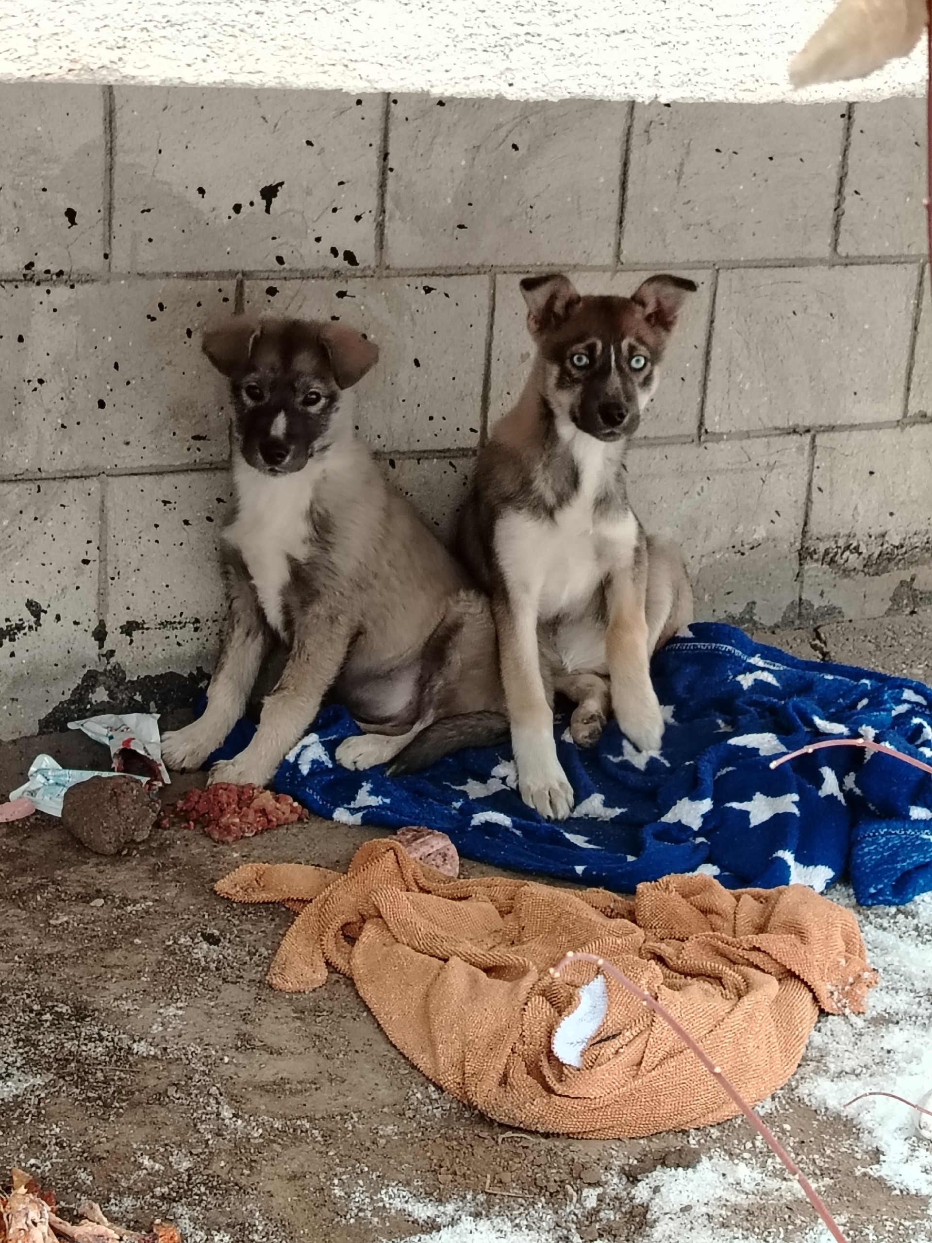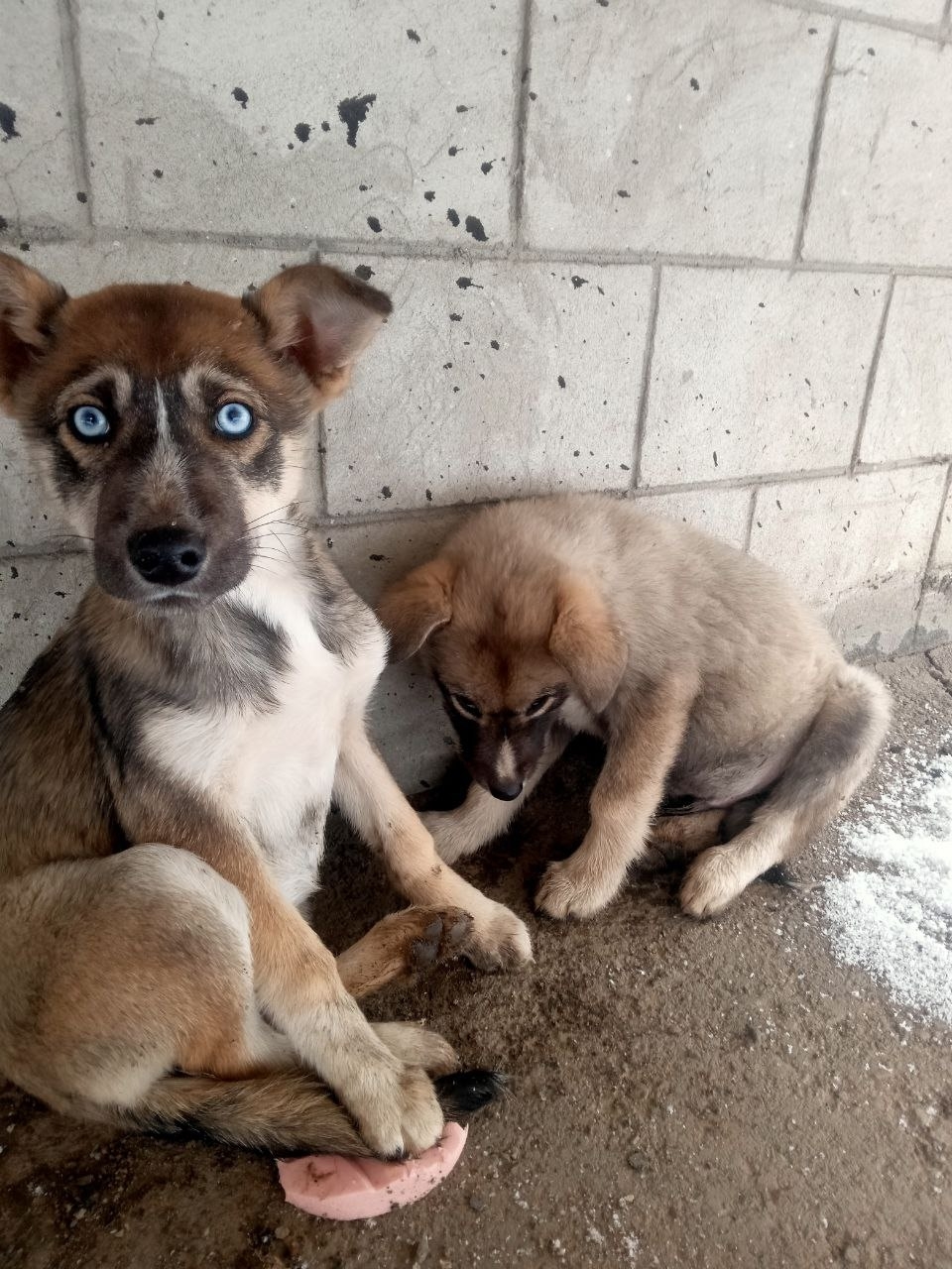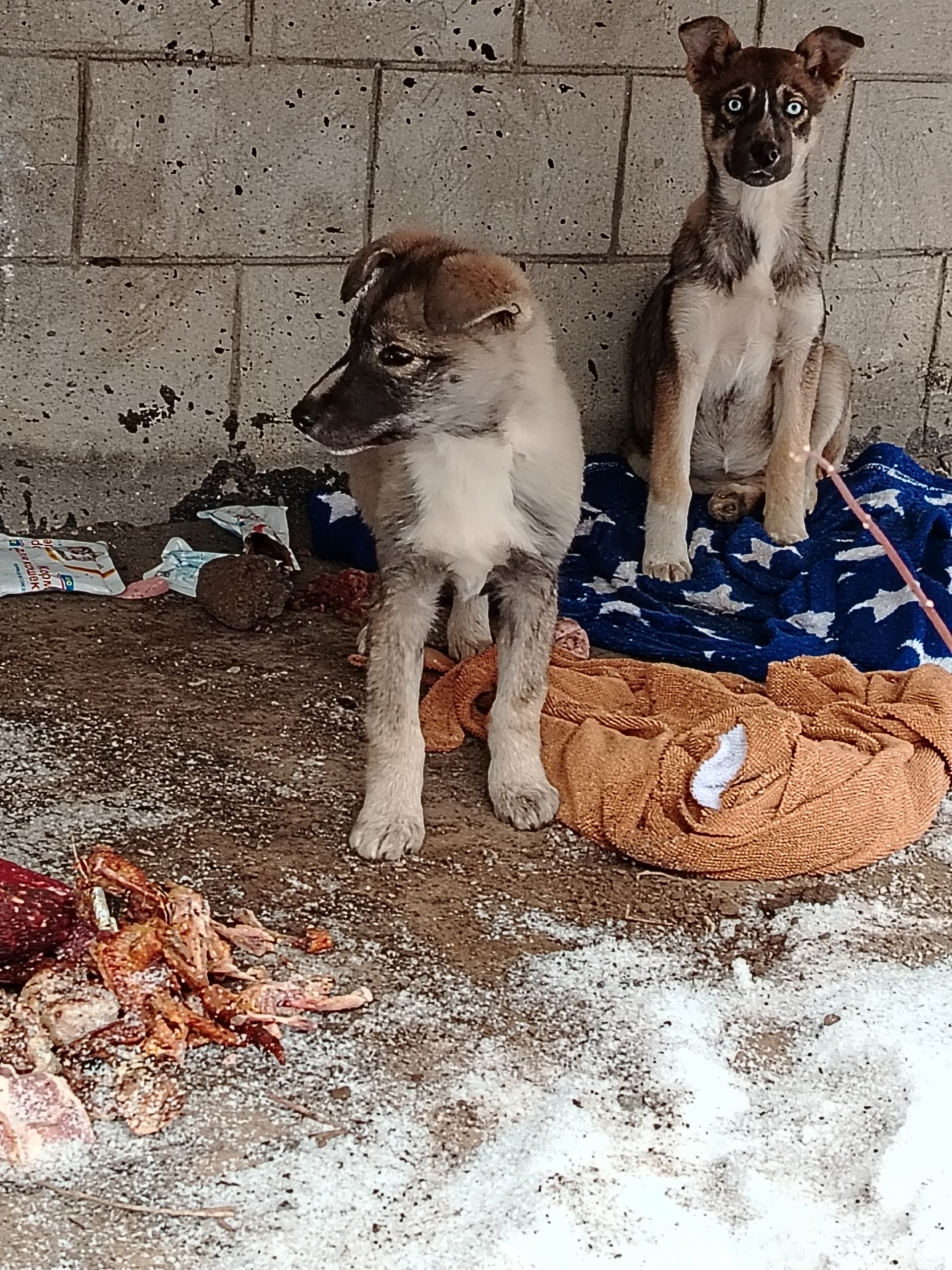 С небесно-голубыми глазами мальчик, второй щенок – девочка. На вид щенкам около 3-4 мес.