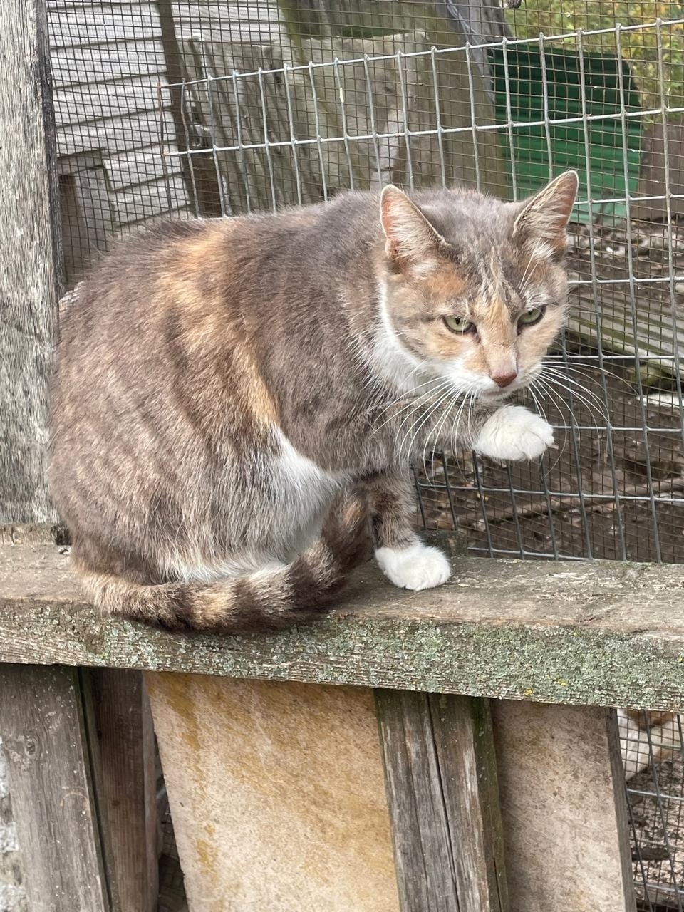 Кошка Муся, немолодая трëхцветочка, скитается у дома и ждёт хоть кого-нибудь, кто приласкает.