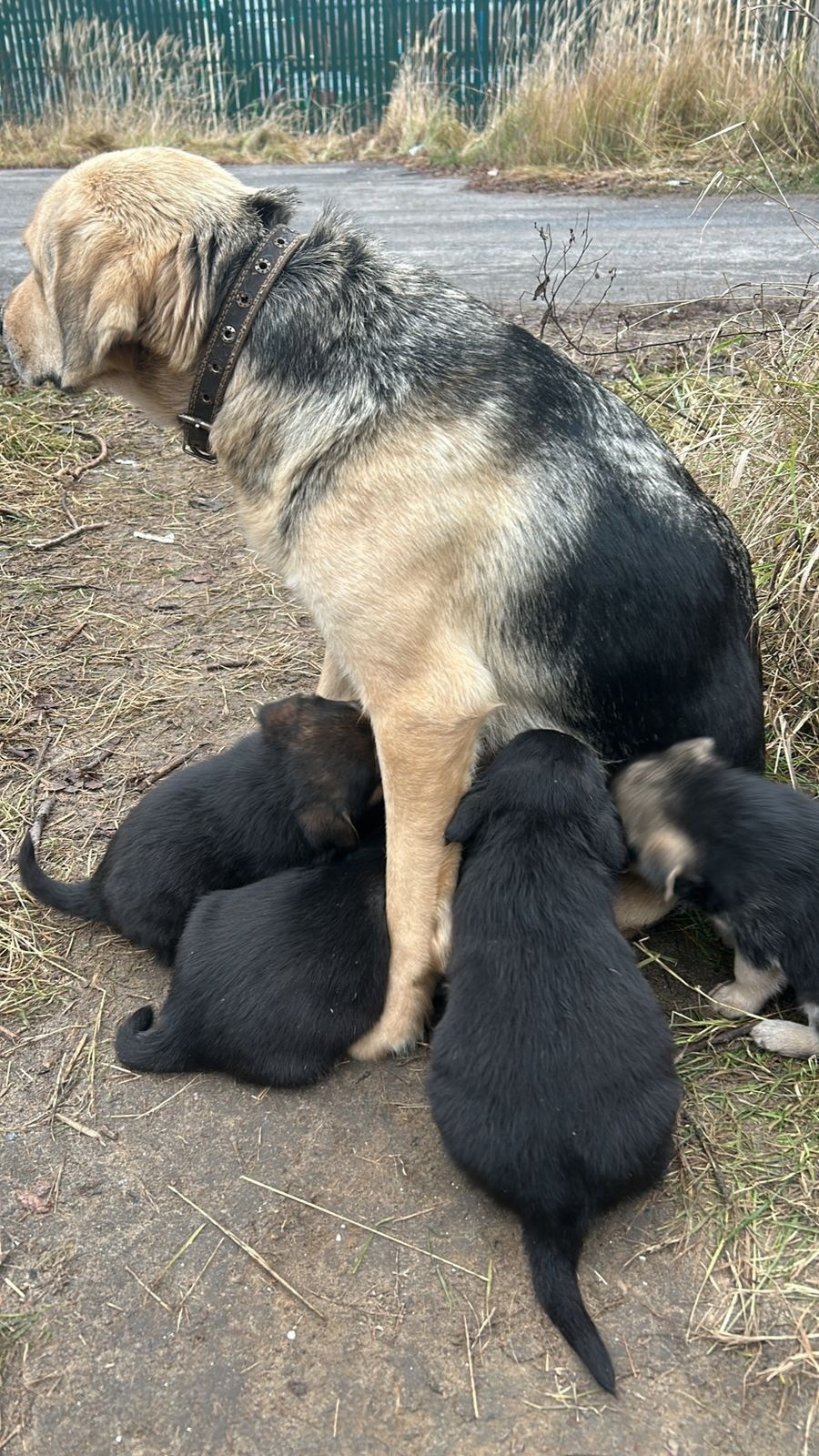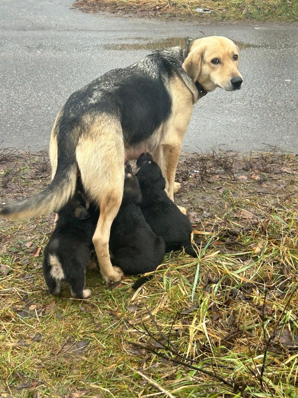 Какие то нелюди выкинули беременную собаку и она ощенилась прямо на земле…. Выживают как могут, щенки дрожат от холода, рядом шоссе, скоро будут выходить на дорогу и их подавит машинами😭….