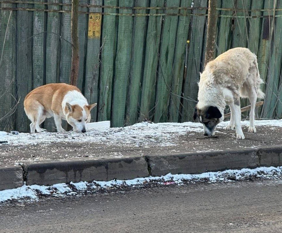 15.12. Кобель корги, окрас рыжий с белым, в ошейнике. Пол метис не известен, но держатся вместе.
