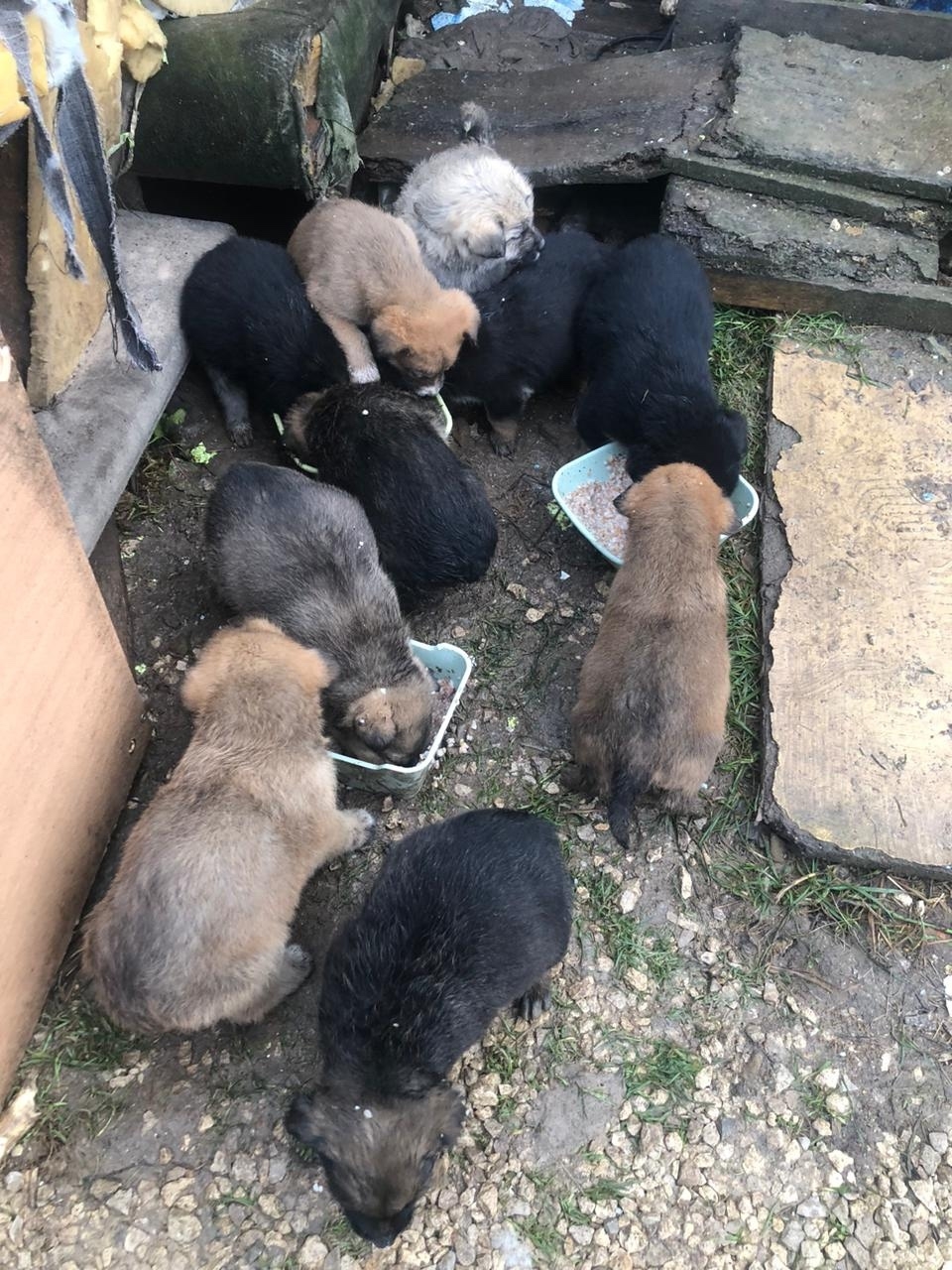 Наталья, на готовила им еды прибежала накормила, они кушают скулят, холодно и голодно. Сегодня к сожалению их даже накормить некому, прячутся в яме, но это десять маленьких жизней!