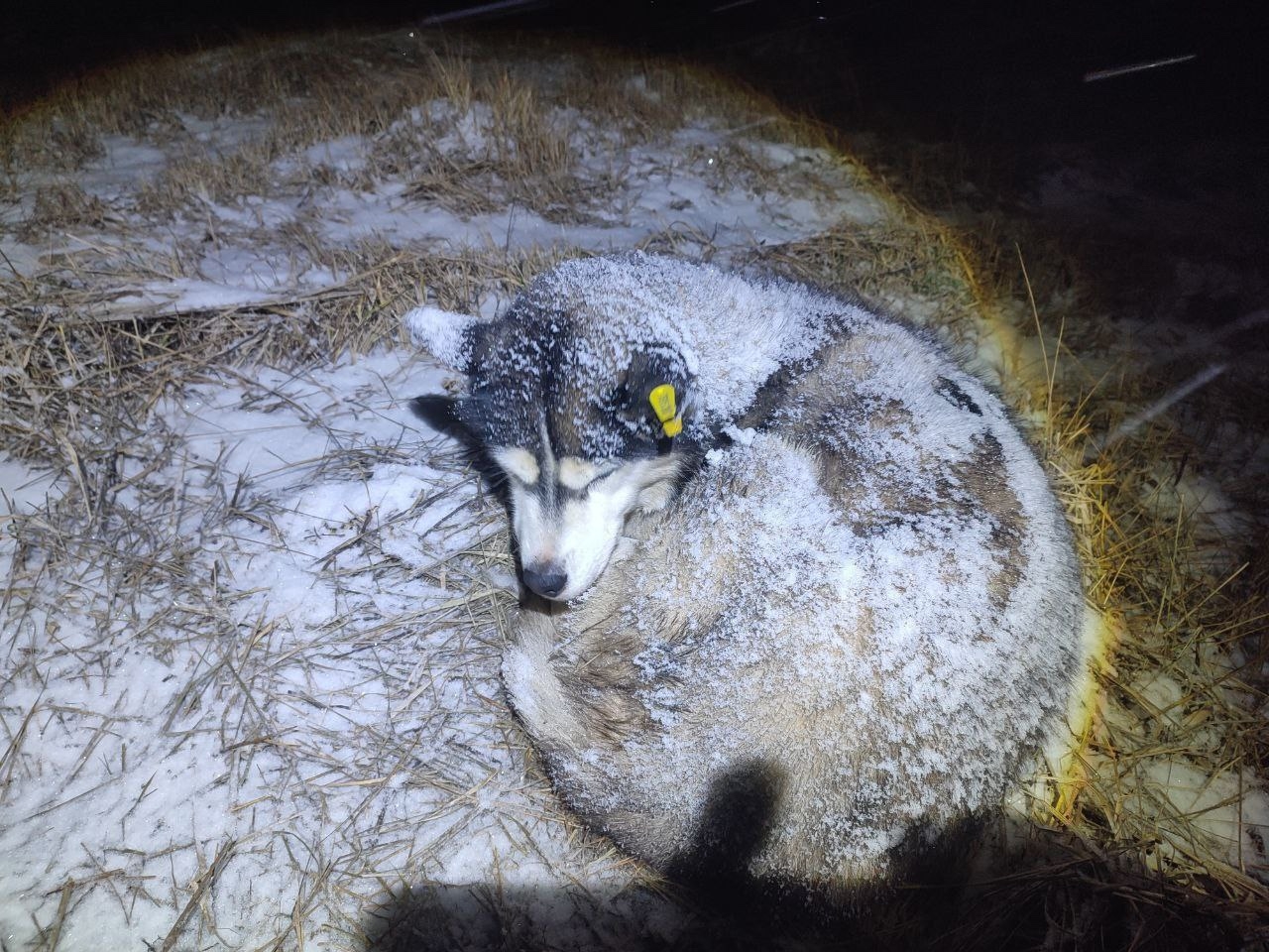 Из- за морозов начала хрипеть, сегодня ночью ее земело снегом. Красивая, на мой непрофессиональный взгляд чистокровная хаски. Бирка на ухе – привита.
