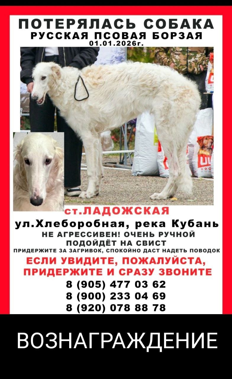 Срочно!!! Будем благодарны за распространение информации! Друзья уже месяц ищут любимую собаку. Кобель русской псовой борзой, мог убежать далеко и заблудиться. Нашедшему вознаграждение! Звоните круглосуточно! Нам важна любая информация о местонахождении собаки.