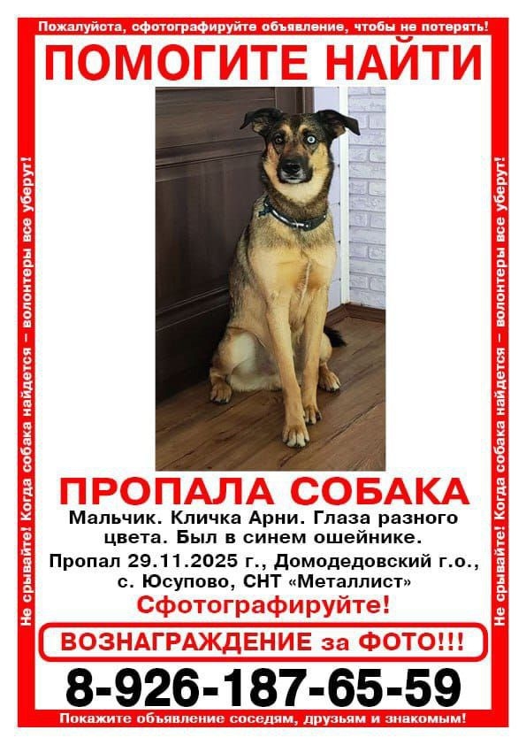 Срочно! Пропал пёс! 29.11.2025 Чеховский округ Во время прогулки..