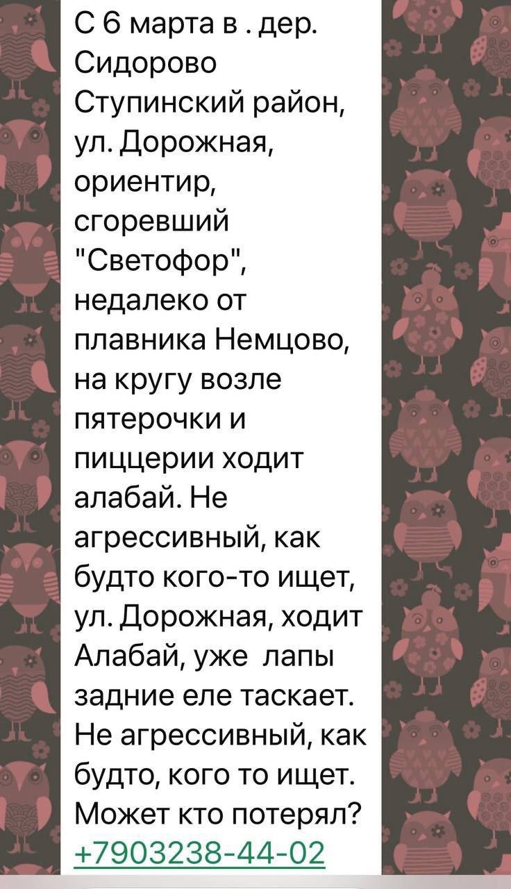 Ступино.д Сидорово замечен алабай… Ступино Автор admin Опубликовано Мар 14, 2026 0 0 Поделится WhatsAppViberTelegramVKOK.ru Ступино.д Сидорово замечен алабай. Скитается 89032384402 https://t.me/HvostatPatrul/217880 0 0 Поделится