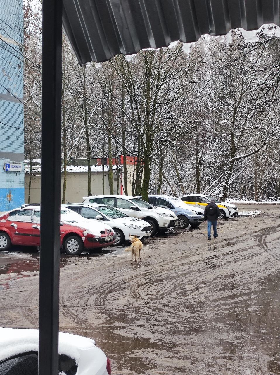 Светлая подтянутая собачка бегает возле отделения почты 141441 в..