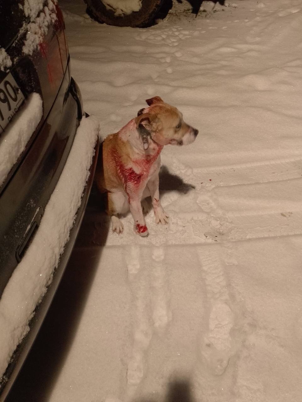 SOS. Нужна помощь. Село Новоникольское, ул. Слободка, сидит замерзает собака вся в крови с драными ранами, к себе не подпускает.
