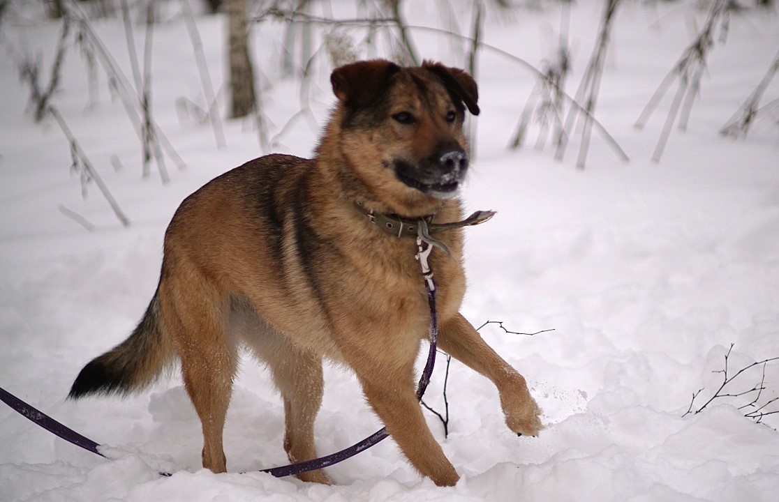 Трише 2 года, она стерилизована и привита, ветпаспорт оформлен. Приучена к прогулкам на поводке. Компактного квартирного размера (около 55 см в холке).