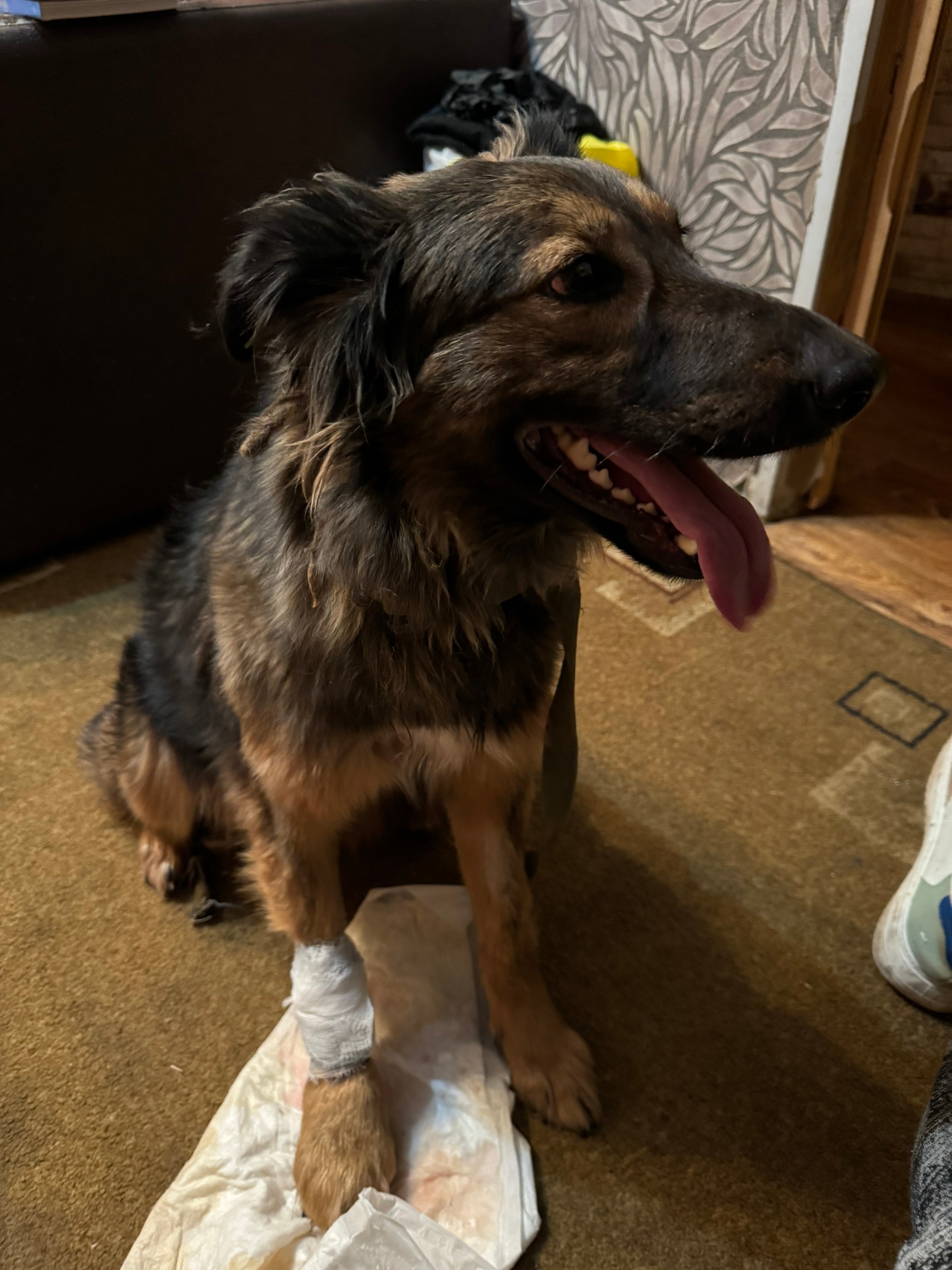 Девочка Герда, лапа перебита с открытой раной и зеленый поводок. На ухе чип