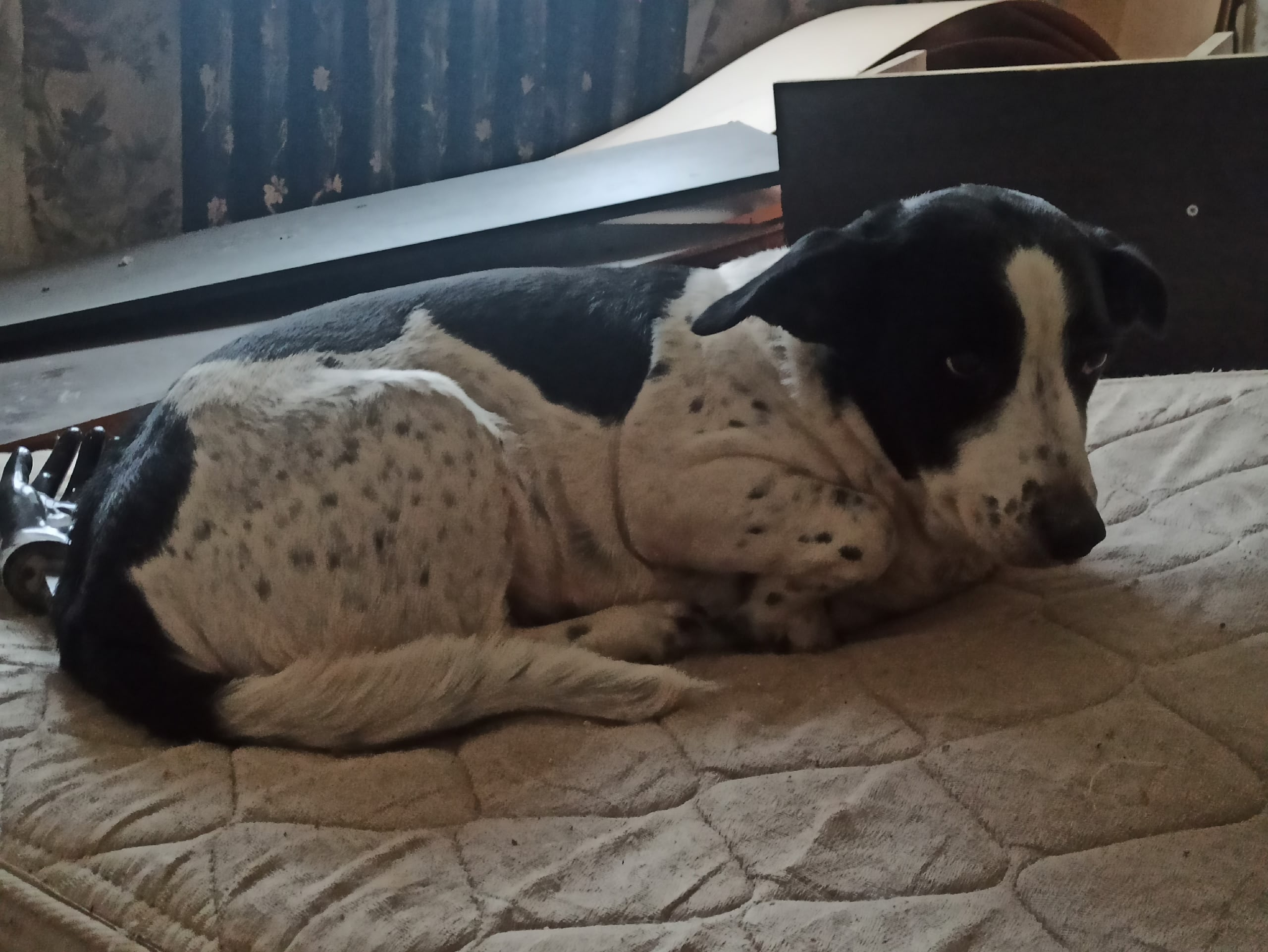 Собака в стрессе, лежит сиротливо на матрасе, не выходит на улицу, мало ест. 😢
