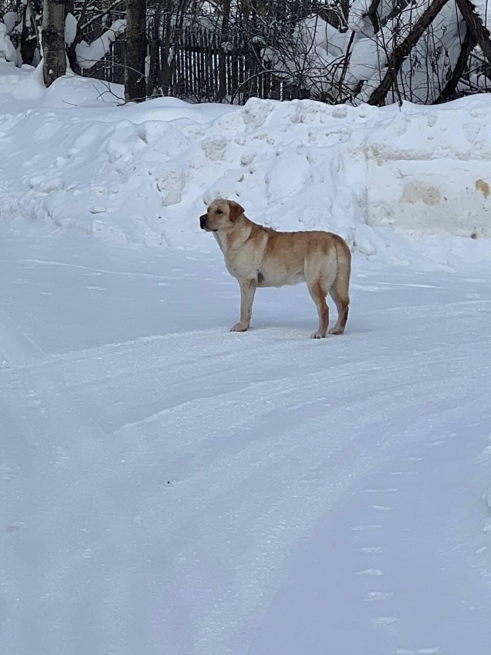 Лабрадор золотистого цвета без ошейника, но явно домашний. Пугливый, на людей лает и не идет. Бегает по деревне, поймать не смогли.