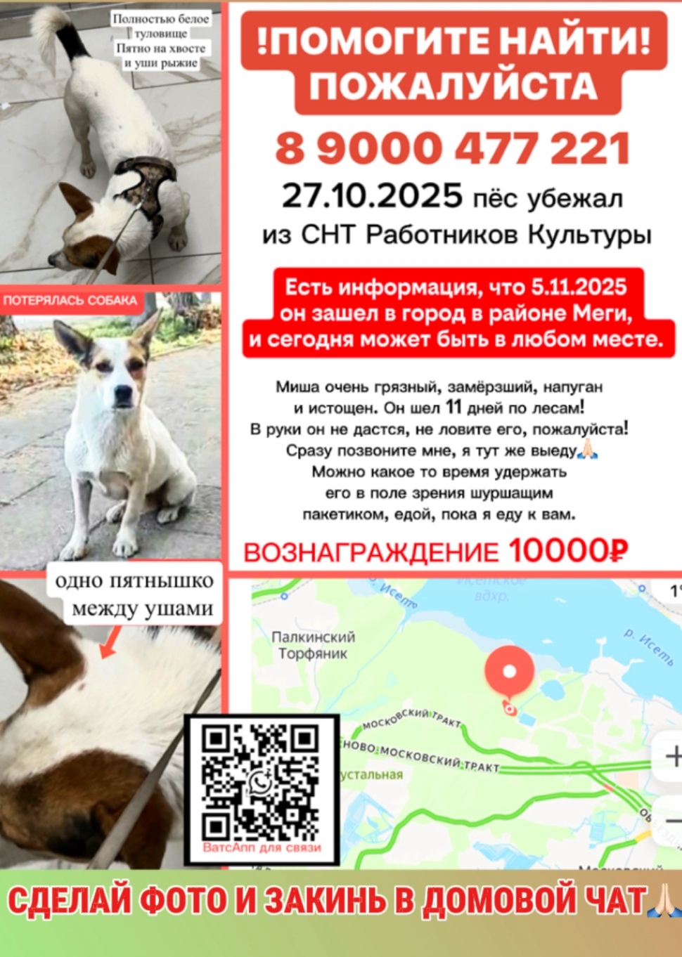Зовут Миша. Мелкий коротколапик. Есть информация, что 5.11.2025 он зашел в город в районе Меги, и сегодня может быть в любом месте. Миша очень грязный, замёрзший,напуган и истощен. Он шел 11 дней по лесам! В руки он не дастся, не ловите его, пожалуйста! Сразу позвоните мне, я тут же выеду. По возможности покормите, сфотографируйте. Можно какое то время удержать его в поле зрения шуршащим пакетиком, едой, пока я еду к вам. Я надеюсь на вашу помощь🙏🏻 Спасибо♥️