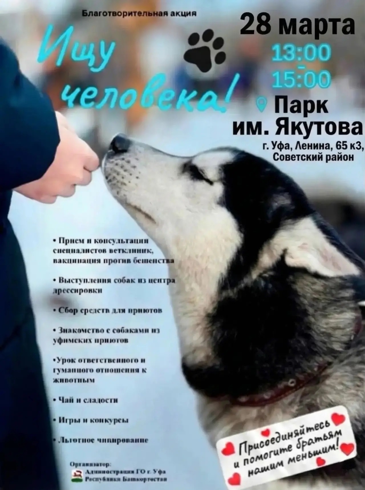 В ближайшую субботу, 28 марта, с 13:00 до 15:00 часов в парке имени Ивана Якутова пройдёт благотворительная акция «Ищу человека», посвящённая поддержке наших четвероногих друзей.