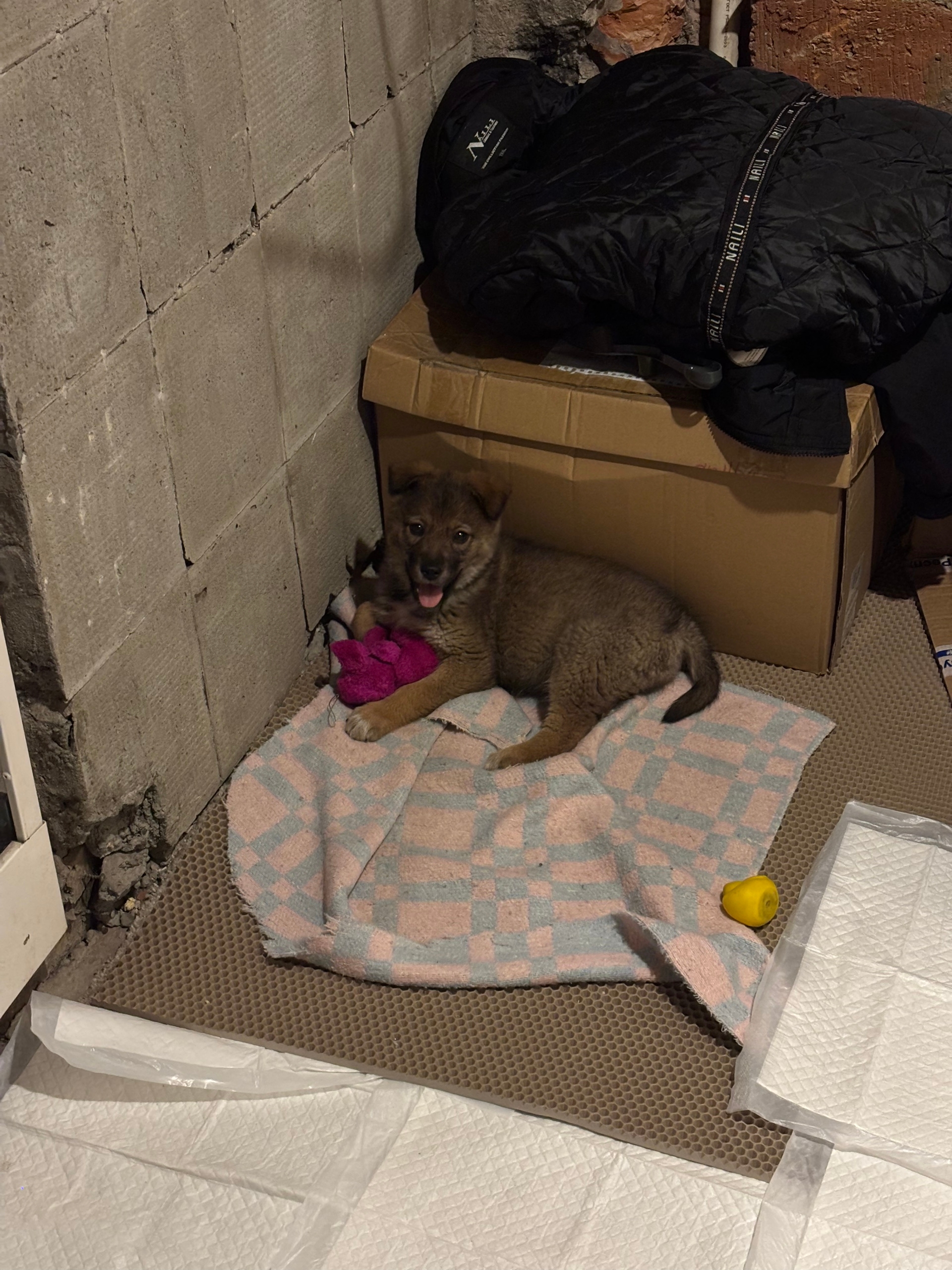 Т.к щенок остался один из 5, забрала ее на передержку из будки на мусорке.