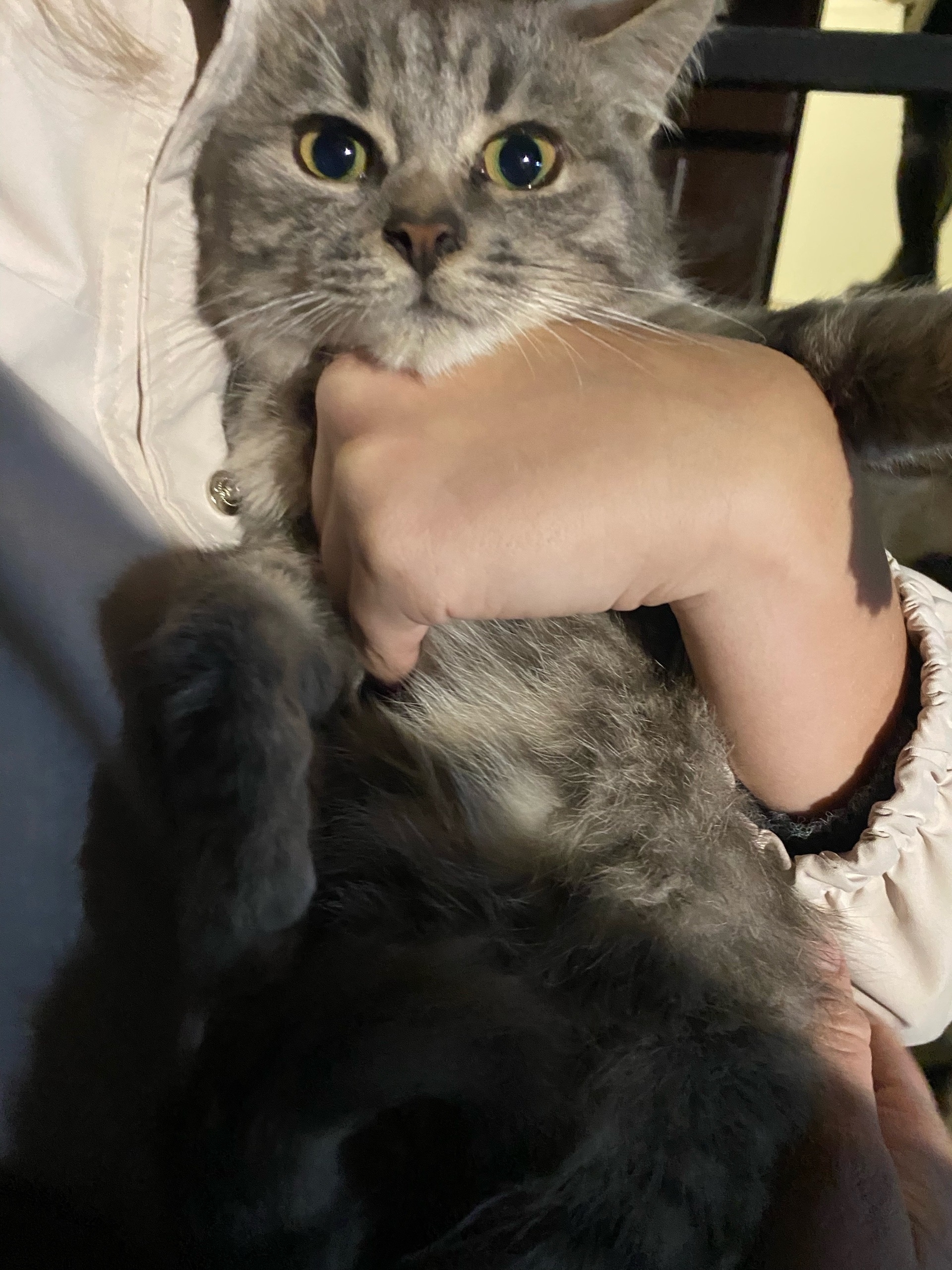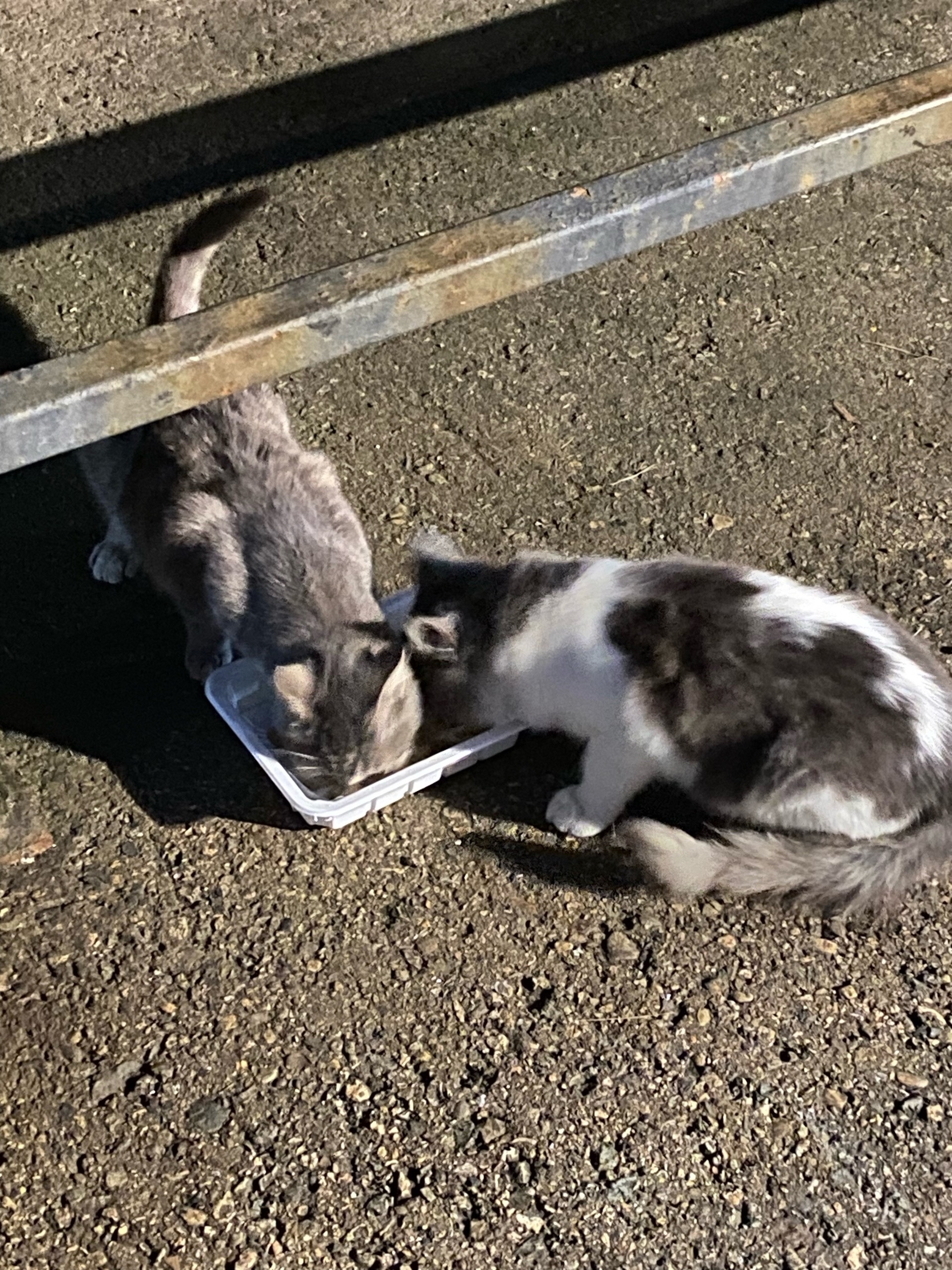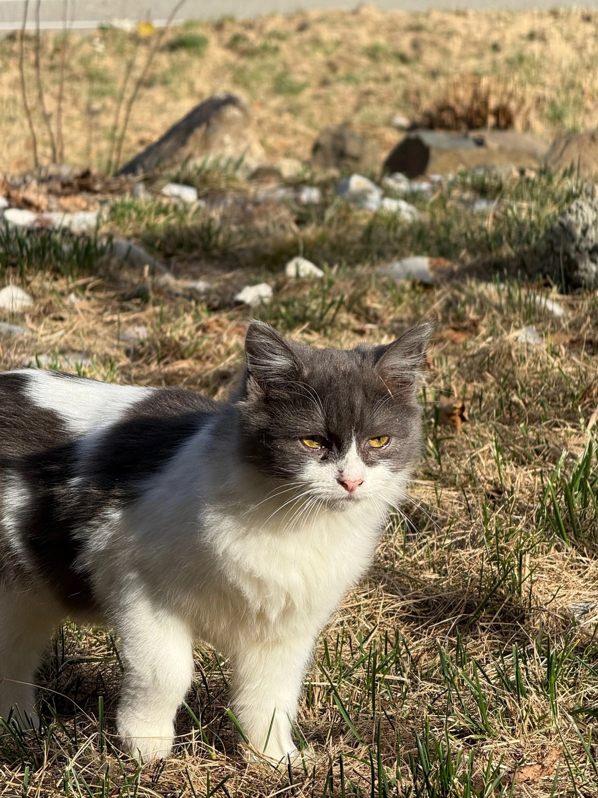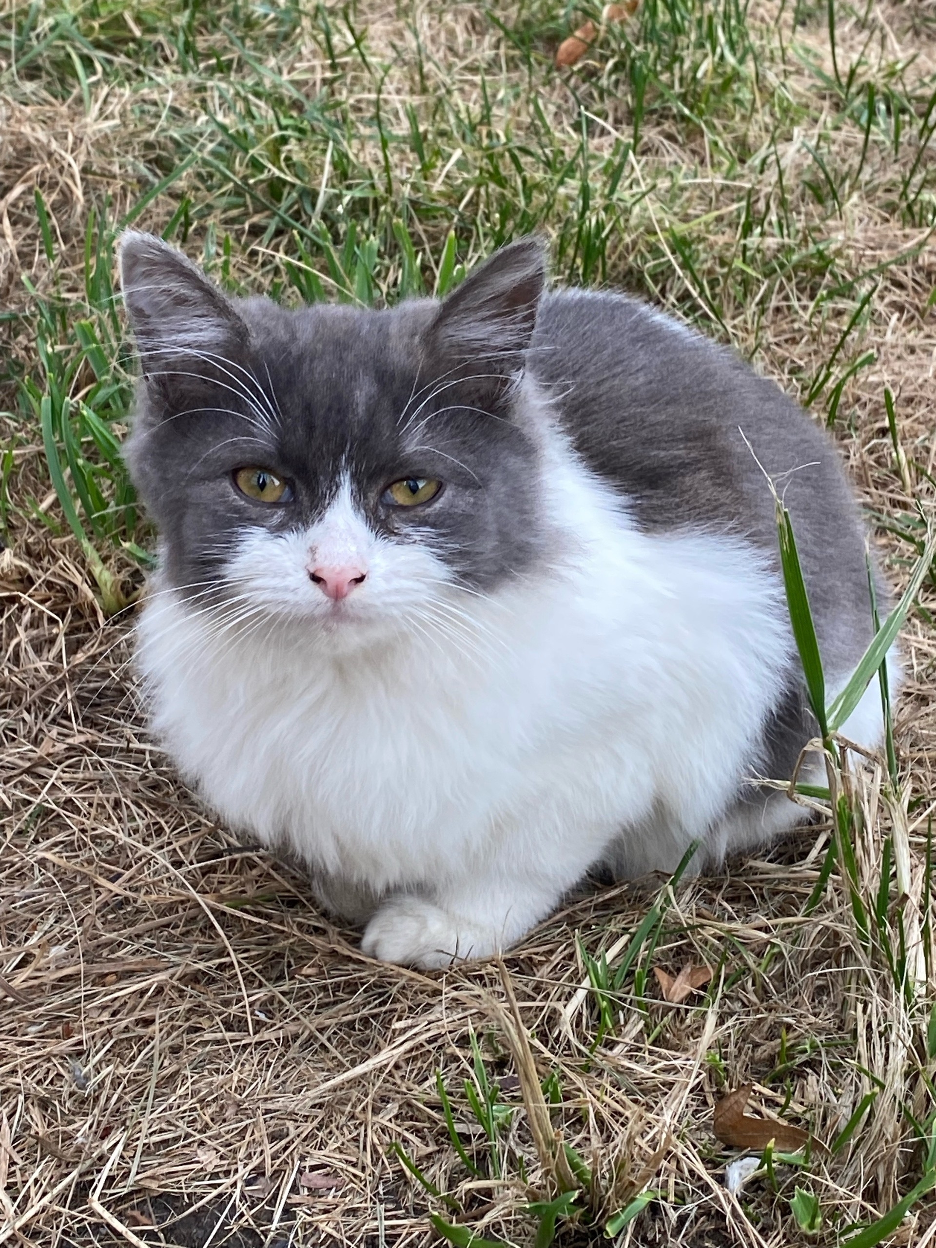 Серенькая девочка, очень ласковая и ручная мурлыка. Белый с пятнышками – мальчик , немного осторожный с человеком, но тоже большой ласкуша со взглядом мультяшного героя.