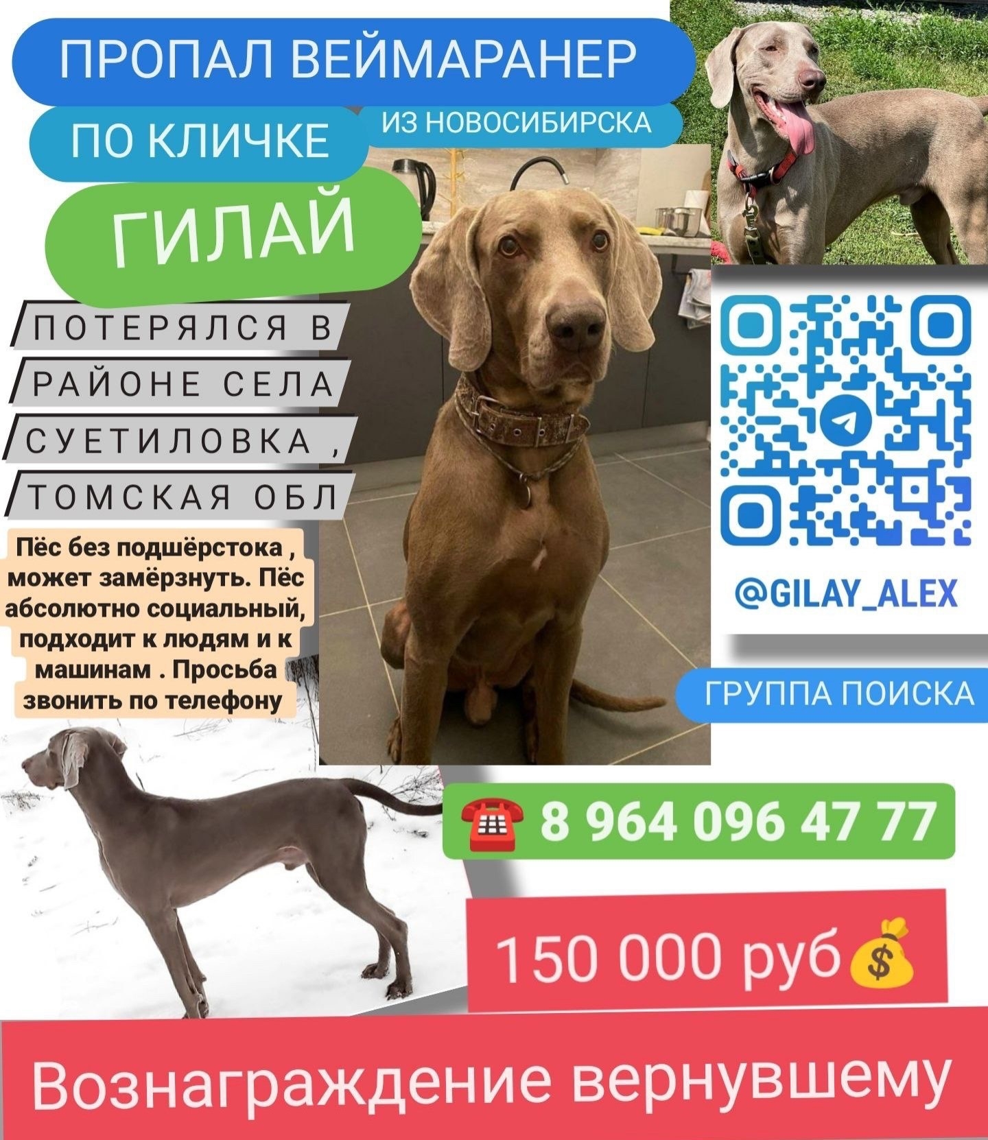 Веймаранер из Новосибирска по кличке Гилай ПРОПАЛ 9 октября 2025 недалеко от г. Томск, в районе пос. Суетиловка. Рядом проходит федеральная трасса.