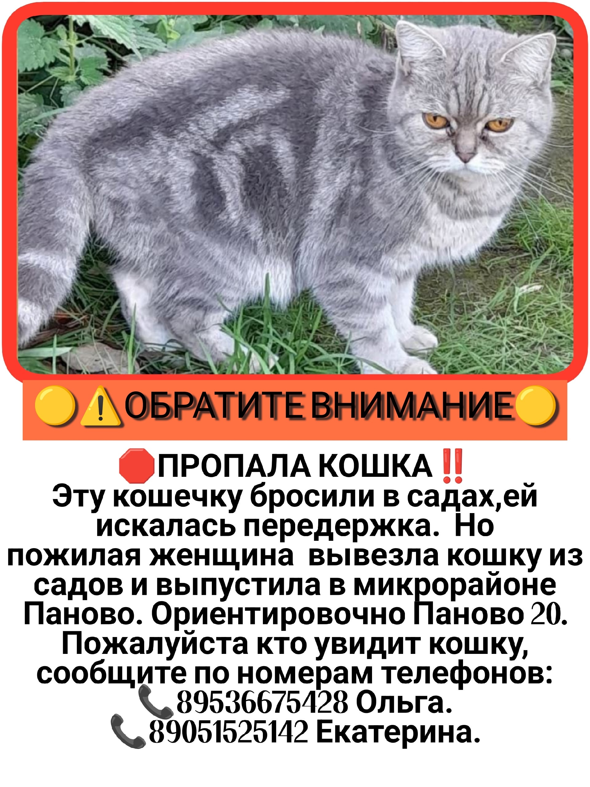 По информации🐈 кошку вывезла из садов пожилая женщина, предположительно вывезла в район Паново 20. Ни один человек ни разу её там не видел. Объявления развешаны. Идут её поиски. Возможно кошка находится в другом месте.