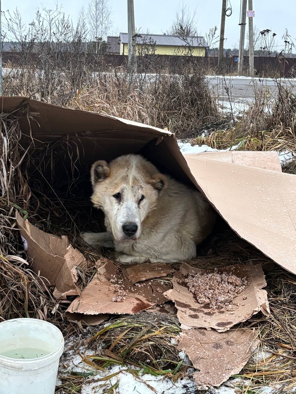 Вот такая БЕДА! Так выглядит самое подлое предательство! У шлагбаума дачного поселка оставлен этот несчастный истощенный и изнеможденный великан алабай! Выставили вникуда! В зиму. В голод и холод!