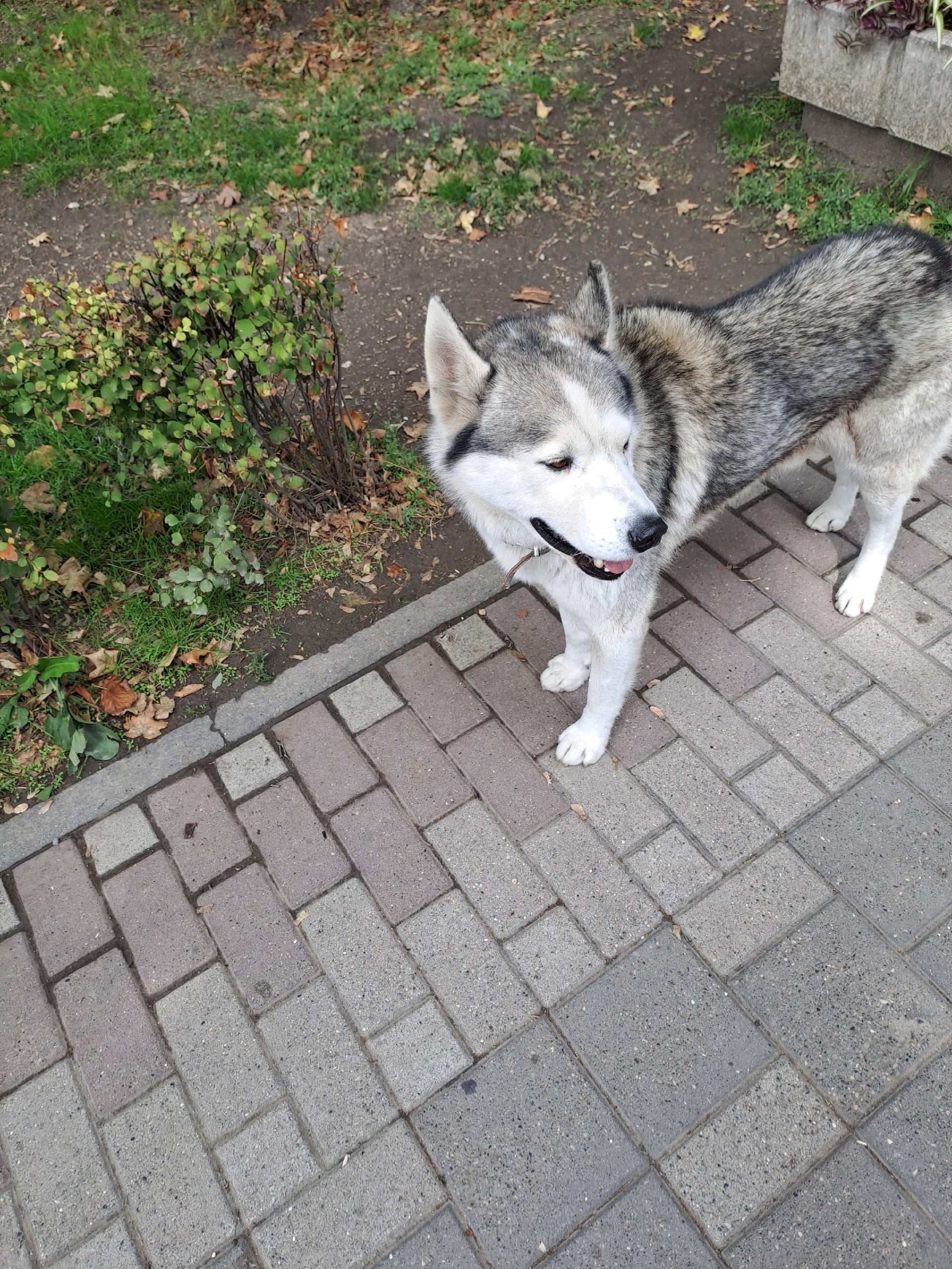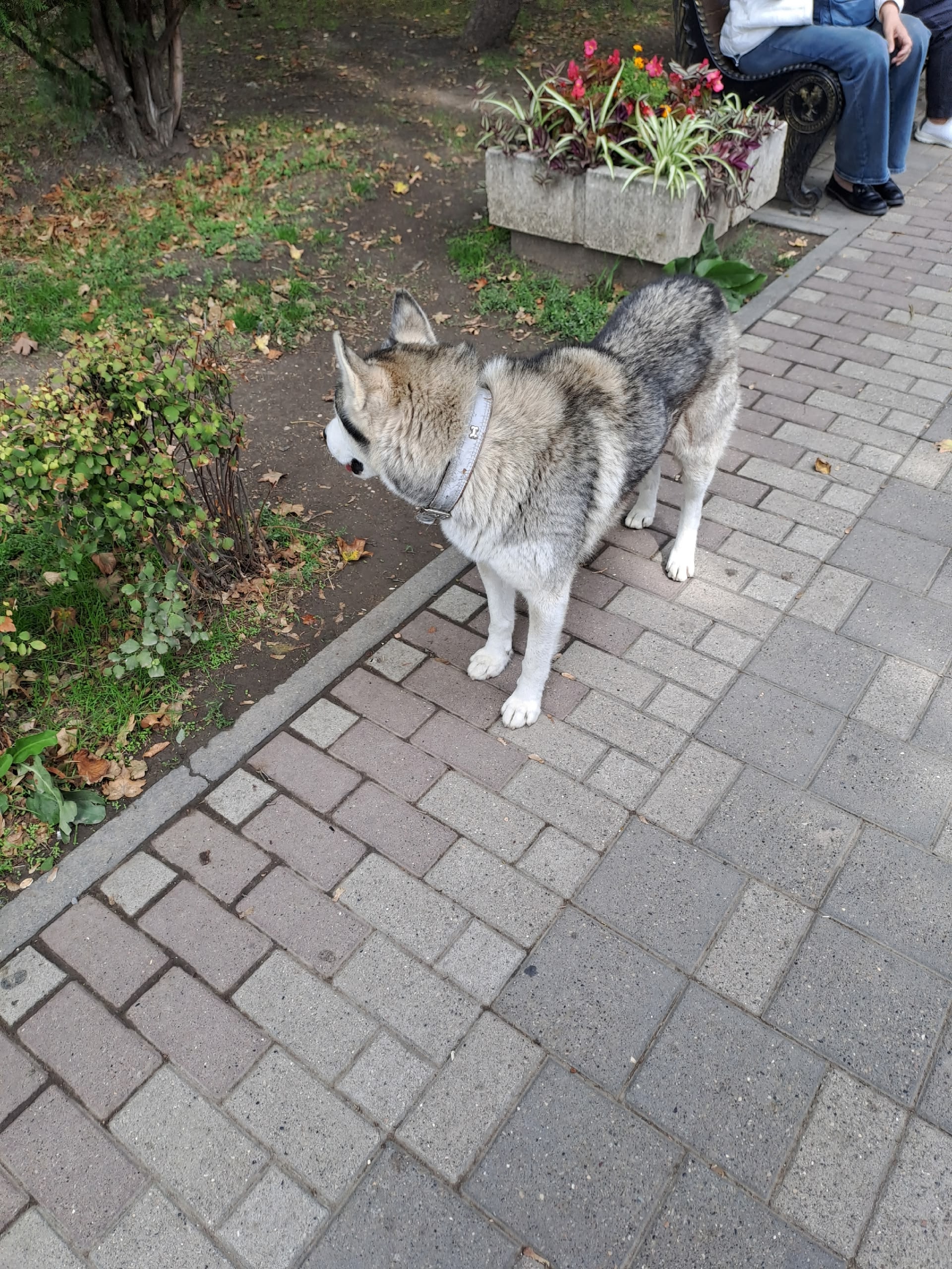 Возможно потеряшка. Пёс в хорошем ошейнике, подходит к прохожим и особенно экскурсиям, ищет возможно хозяина. Парк Цветник, центральная часть.