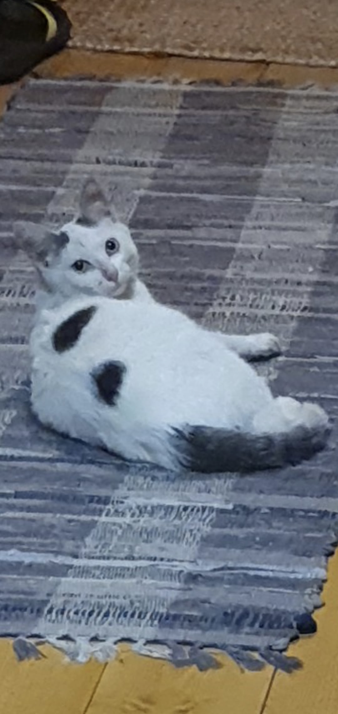 кроме- черные пятнышки между ушей, симметричные, два круглых пятна на спине, хвостик серый с белым кончиком, на животике голое пятнышко с орех, от ранки, давнишнее.