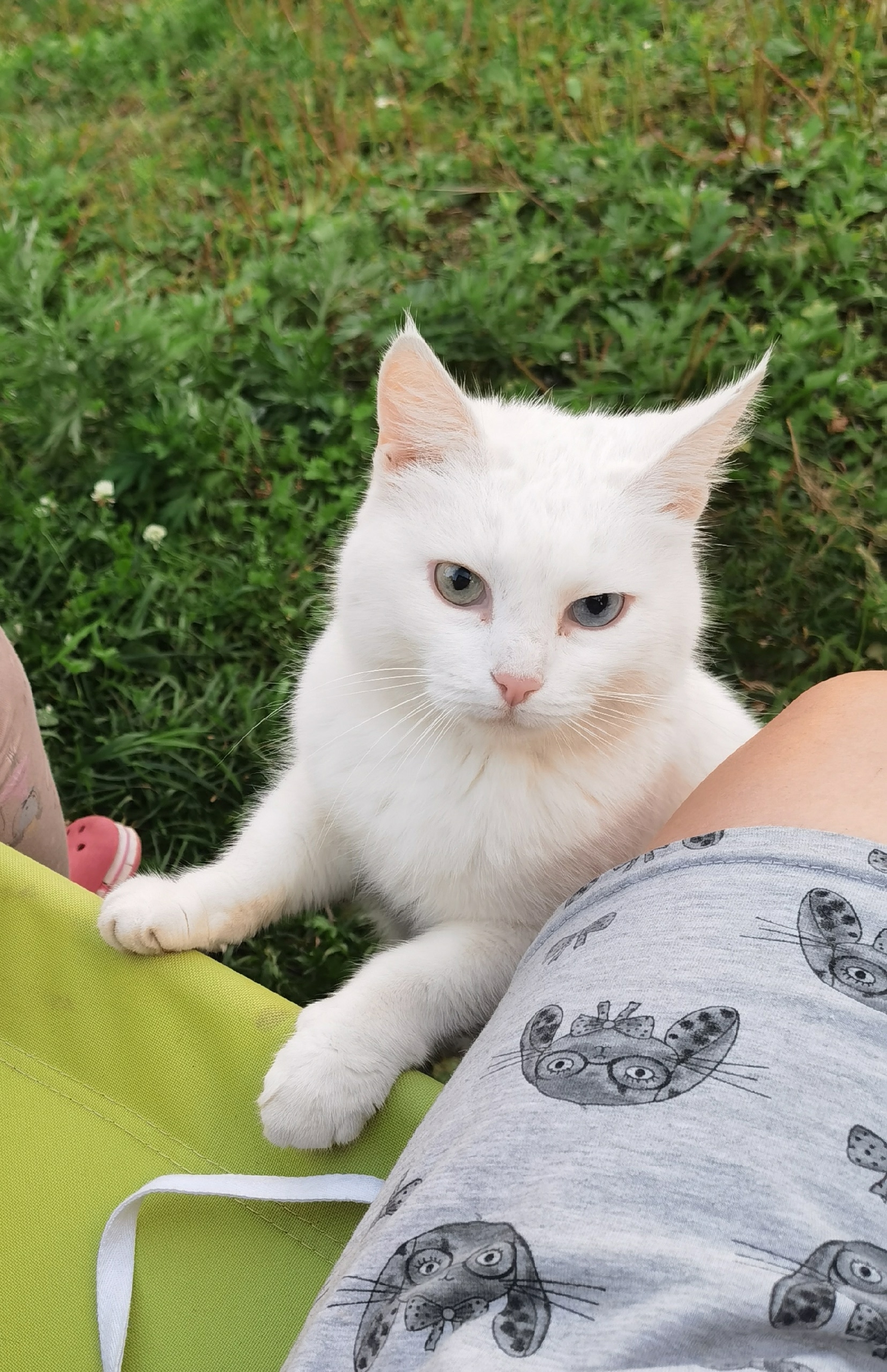 Из примет: шерсть вся белая, глазки разного цвета, очень ласковая.