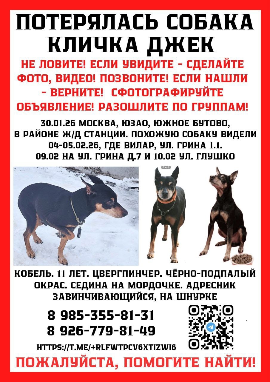 Здравствуйте, помогите пожалуйста с поиском😭🙏Потерялась собака цвергпинчер 30.01 в южном Бутово, в районе железнодорожной станции. Кобель по кличке Джек, на шее адресник, добрый , контактный , на кличку отзывается , собаке 11 лет борода седая, если кто видел позвоните пожалуйста🙏