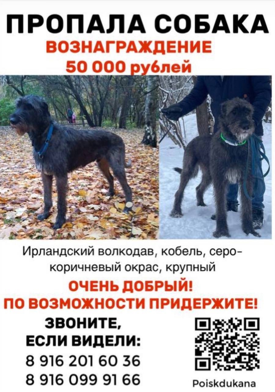 Ирландский волкодав, кобель, крупный, серо-коричневый окрас. Был в синем ошейнике и светящемся ошейнике